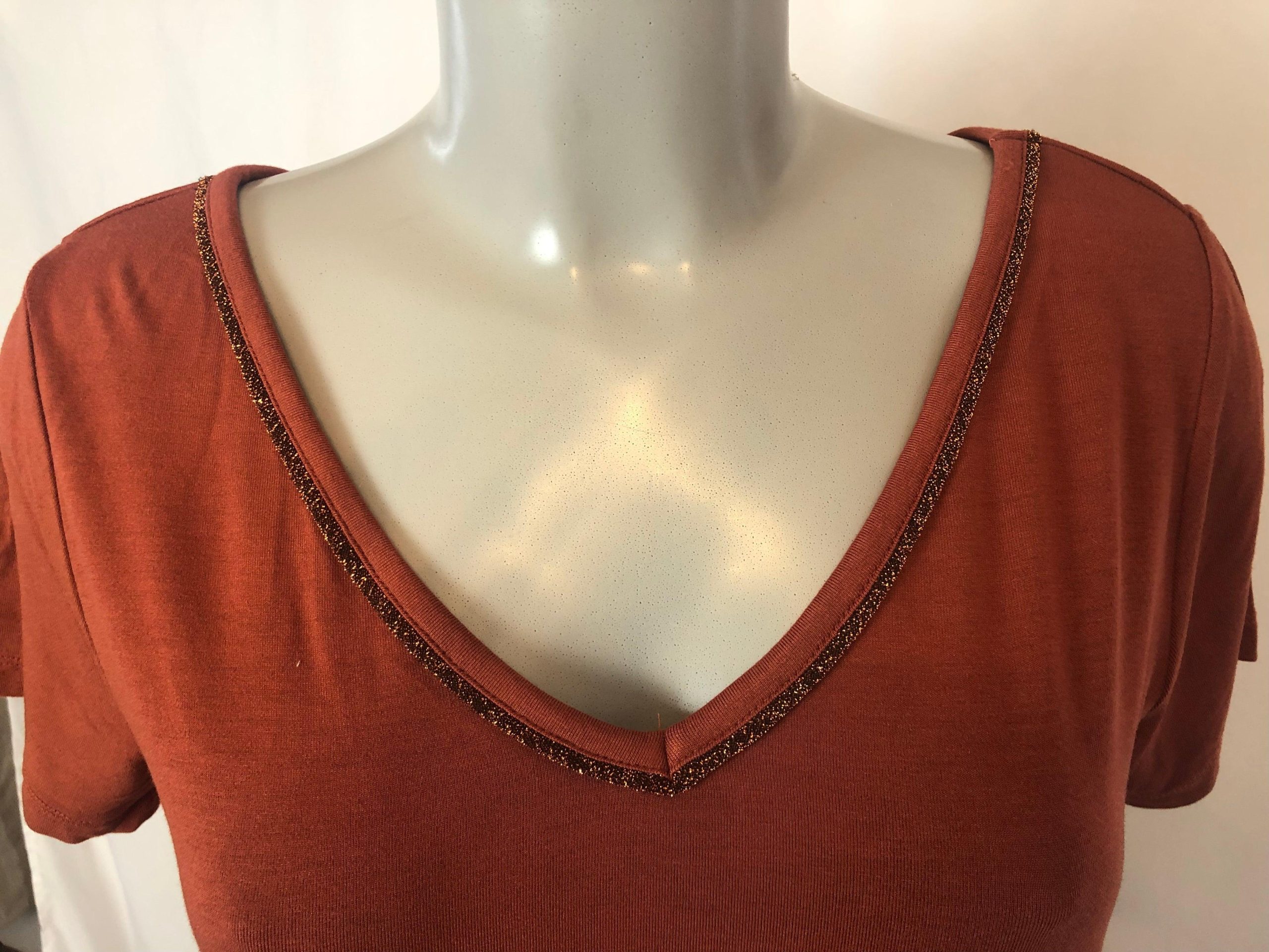 Tee-shirt brun acajou pour femme de la marque Deeluxe. Ce joli T-shirt a une coupe fluide et droite, une encolure pailletée en V et des manches courtes. Super prix de déstockage. Matière : 95% viscose – 5% élasthanne Marque : Deeluxe Couleur : Brun acajou Valeur en boutique : 26 € Taille : XS / […]