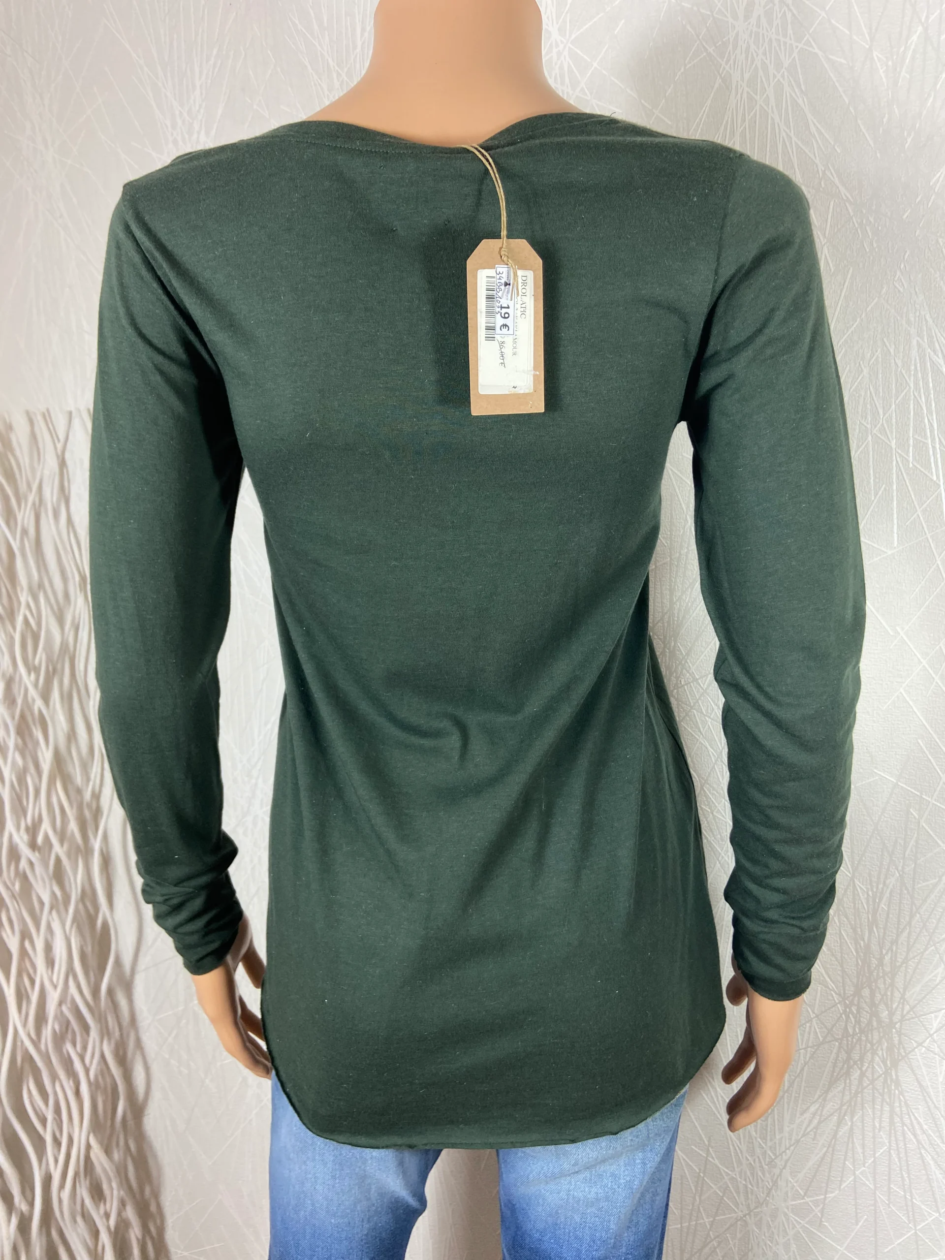 T-shirt kaki fin à manches longues avec inscription l’Amour Toujours, encolure en V. Un joli haut pour femme, pas cher et sympa. Couleur : Vert kaki Matière : Coton 50% ; 49 % modal et 1 %polyester Marque : Drolatic Taille : S / 34 – Réf : 34BB1033 Dimensions : Largeur épaule : 38 […]