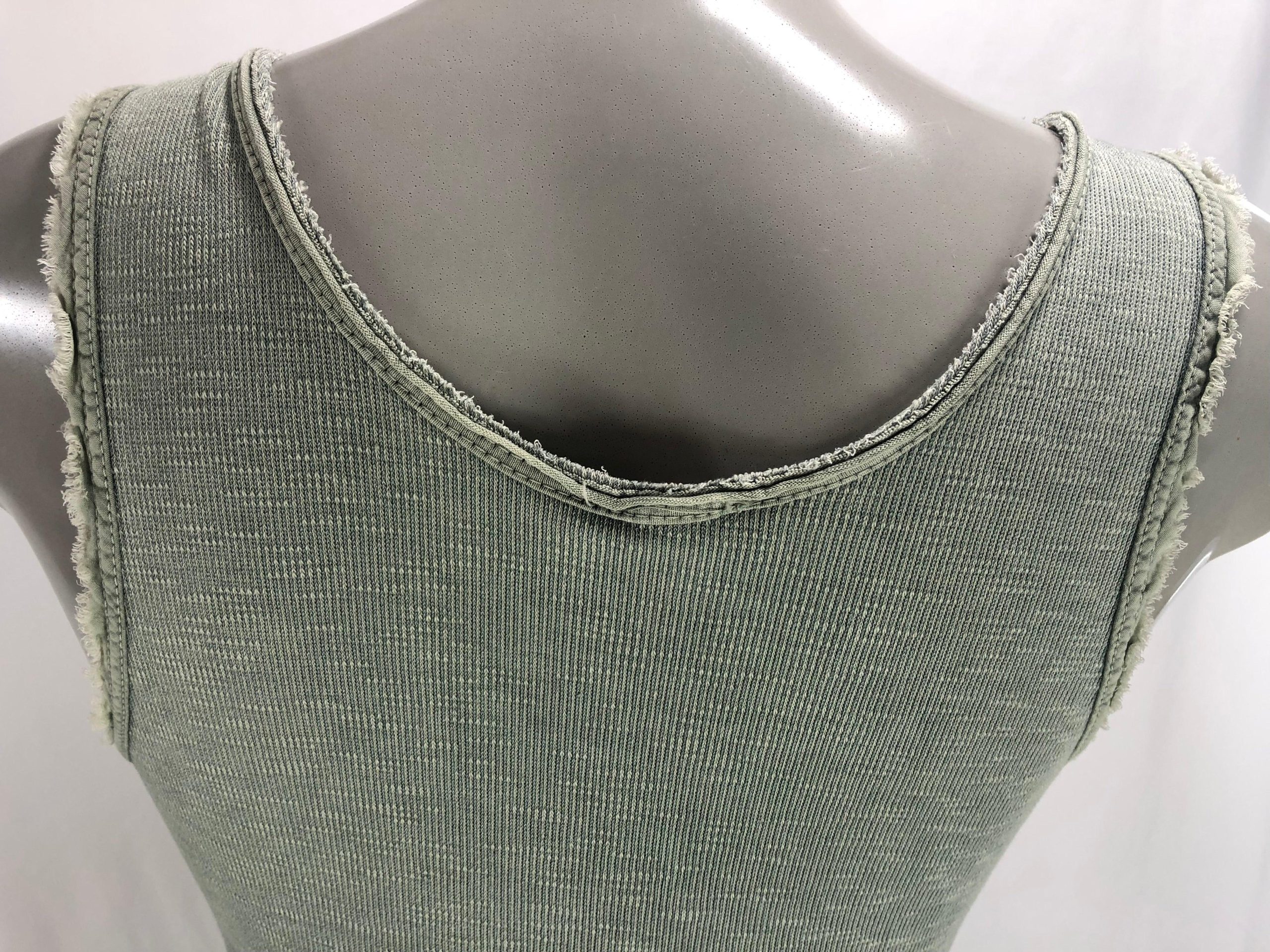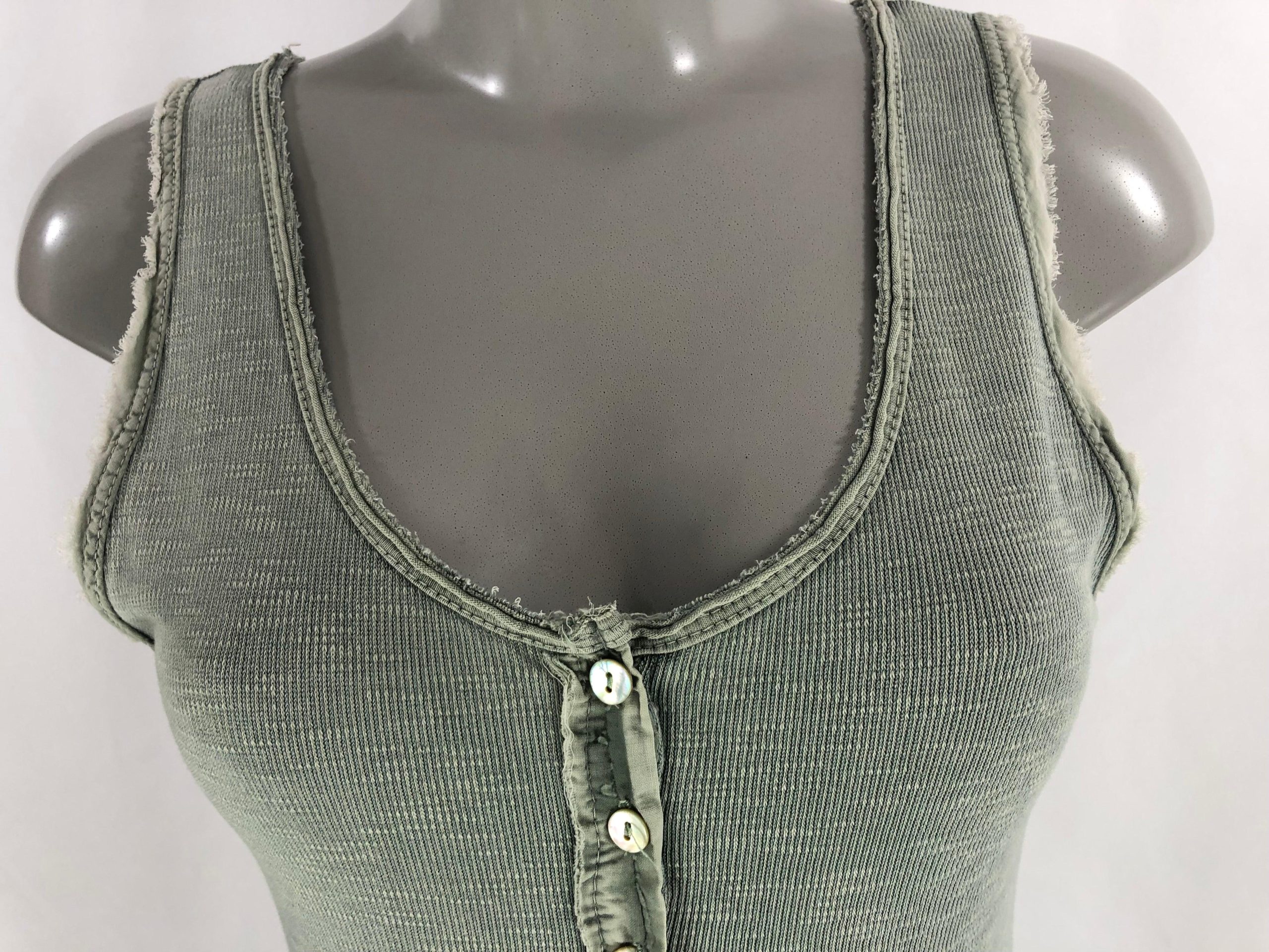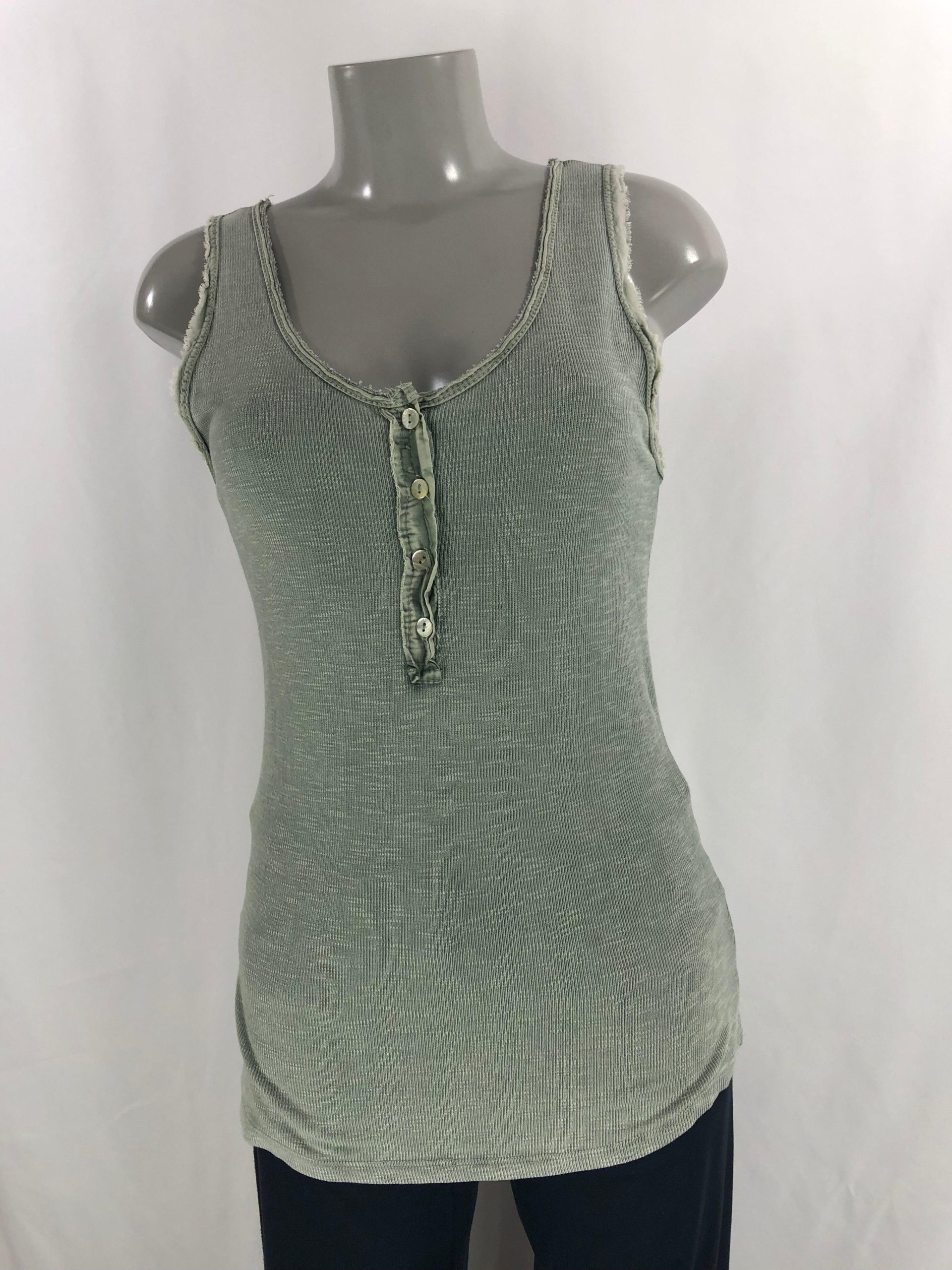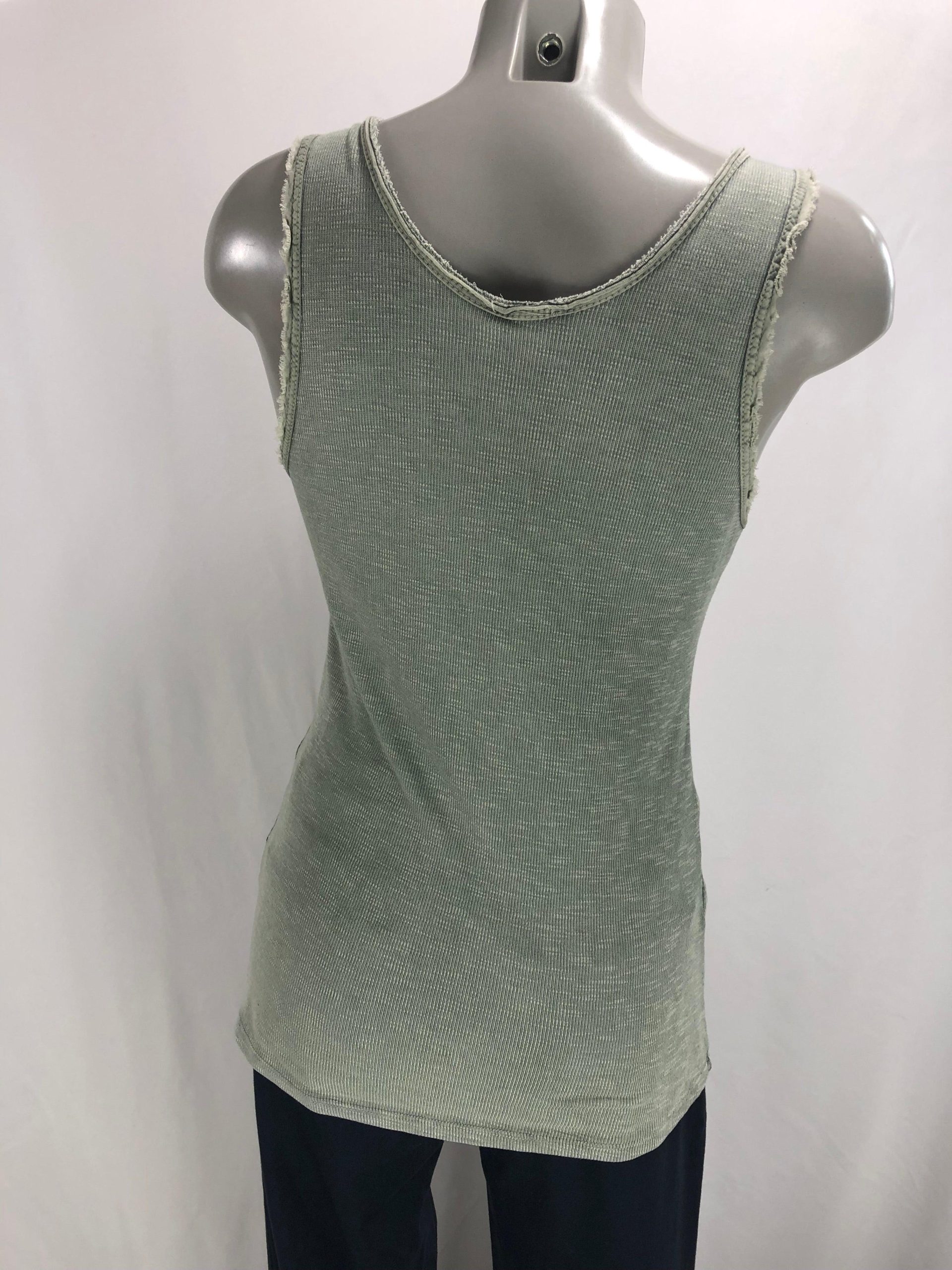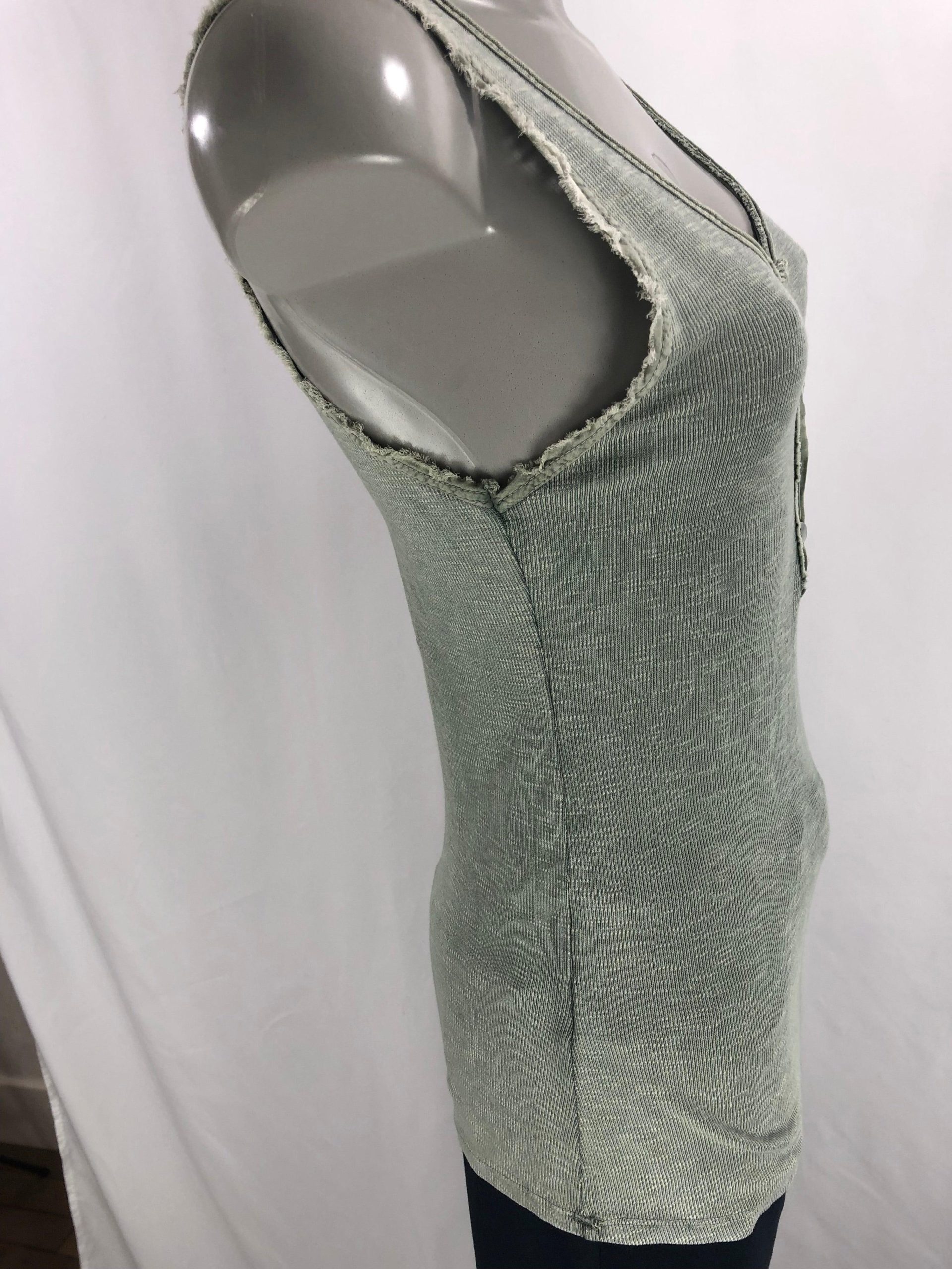 T-shirt kaki sans manches pour femme, encolure et ras de manches avec déco fantaisies de la marque Carla Giannini. Couleur : Vert kaki Composition : 100% coton Taille S / 36 – Réf : 36BT981 Valeur en boutique 35€
