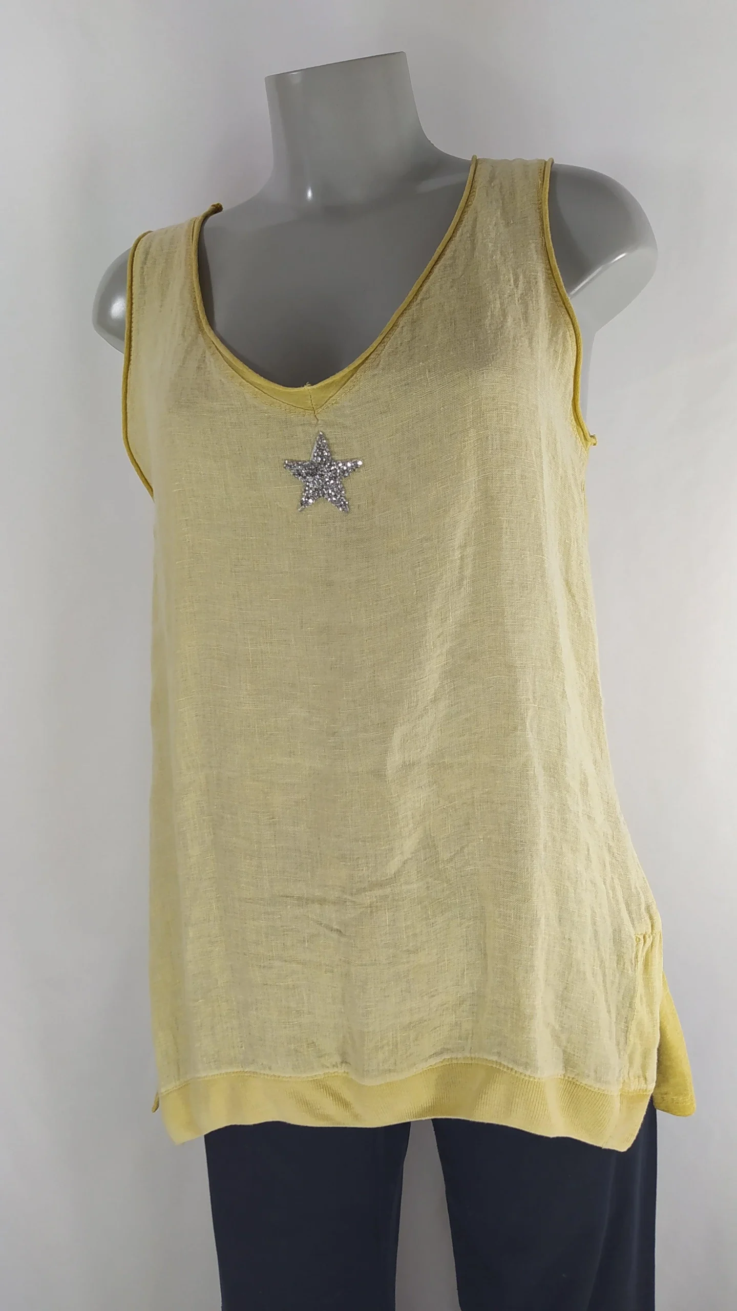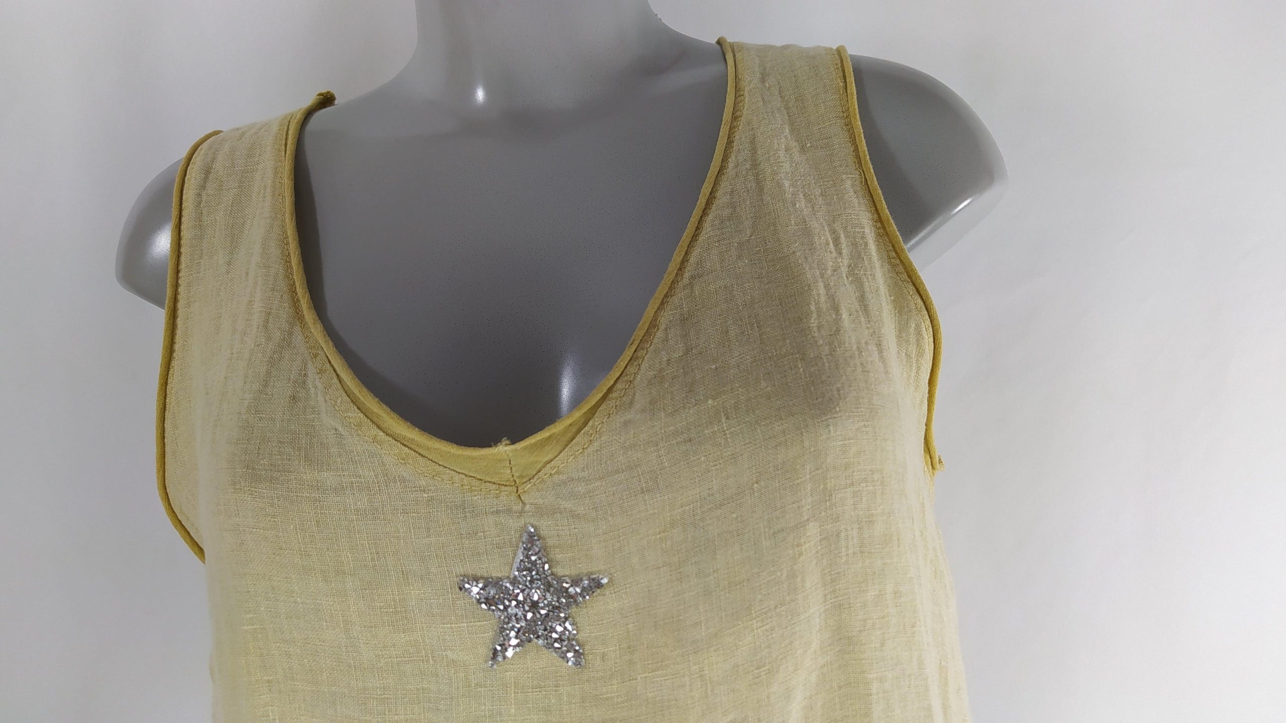 T-shirt lin coton sans manches col V, étoile en strass Coutureve