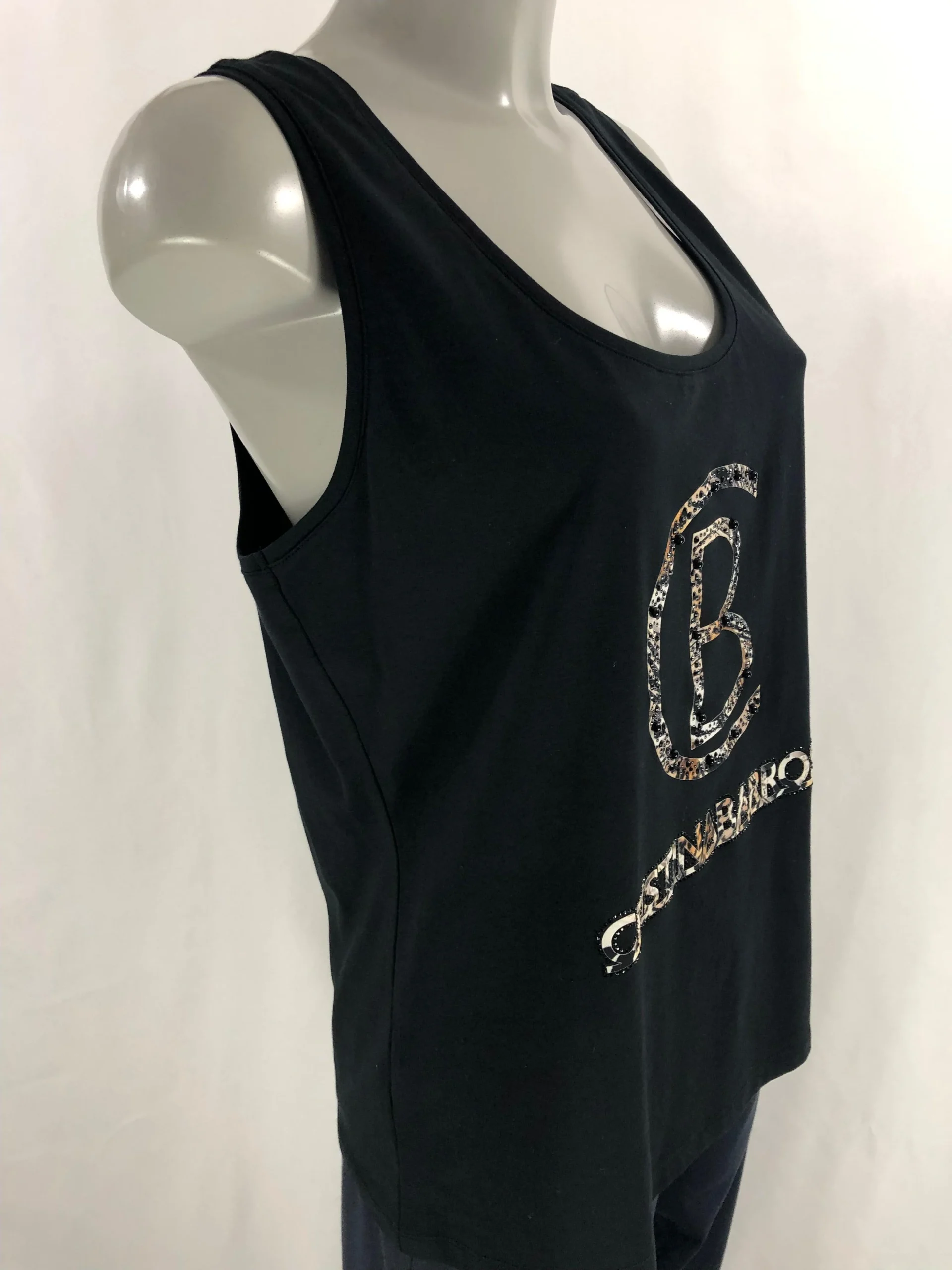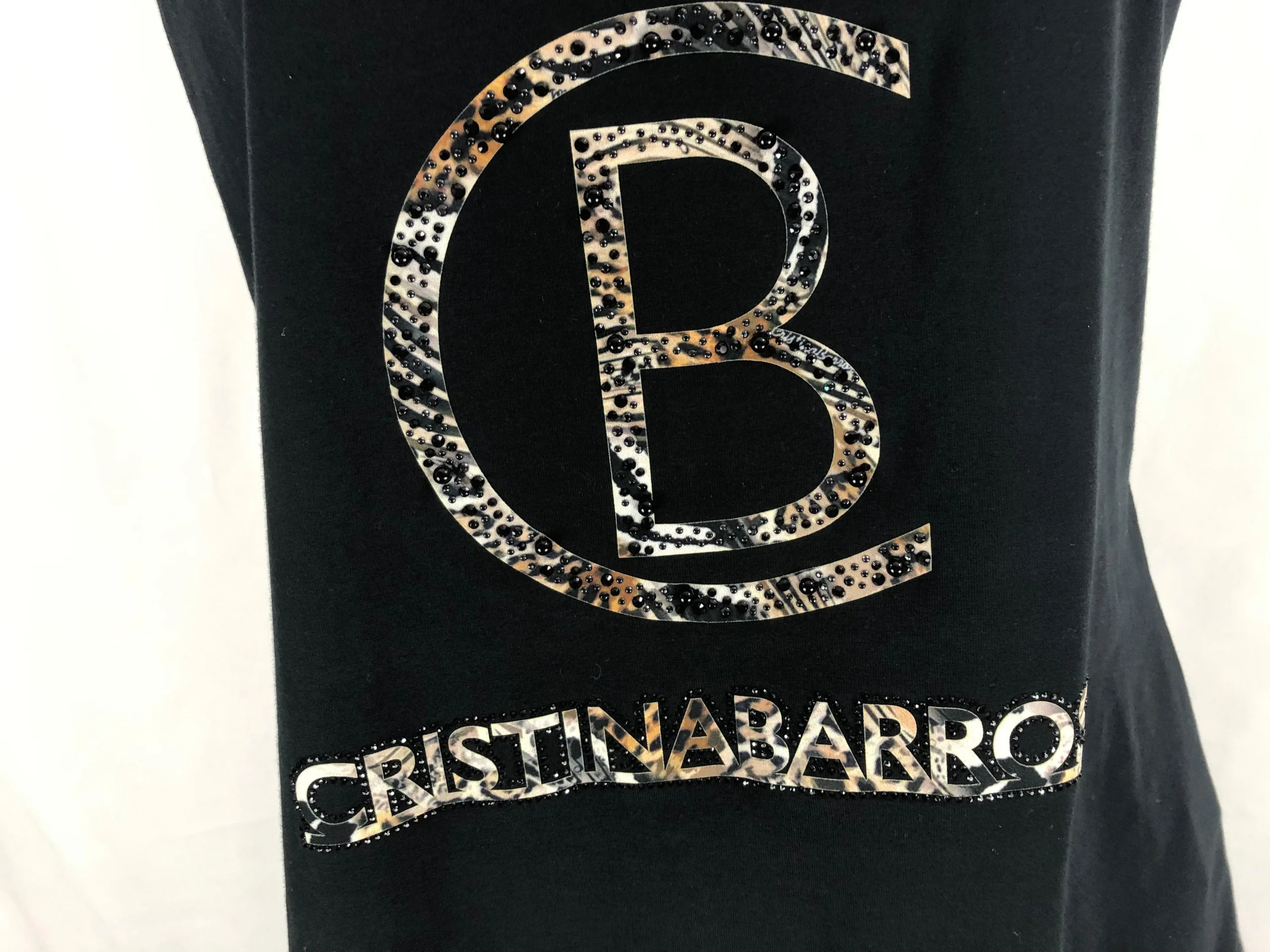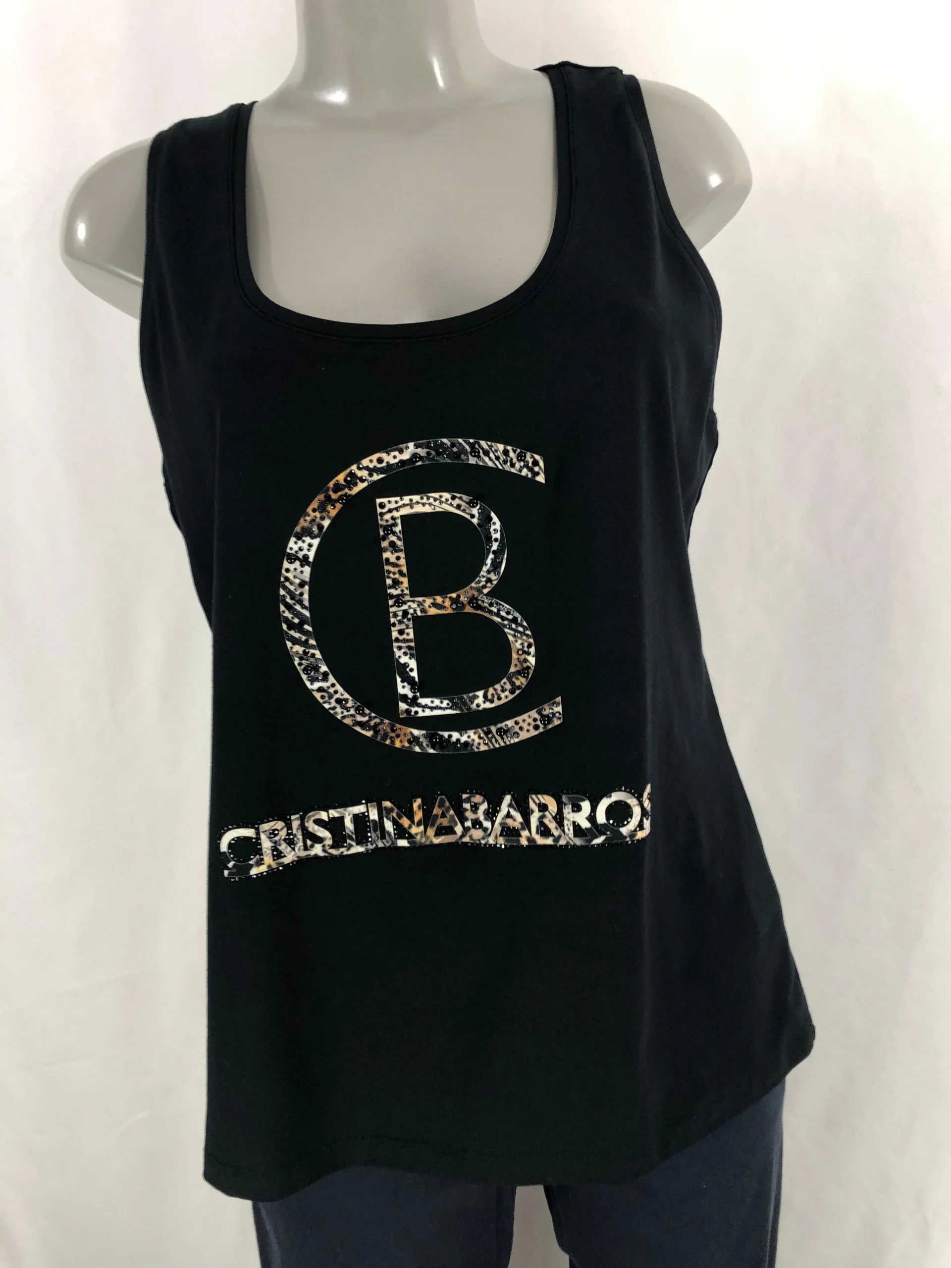 Joli T-shirt noir sans manches pour femme, avec inscription de perles et strass, par Christina Barros.