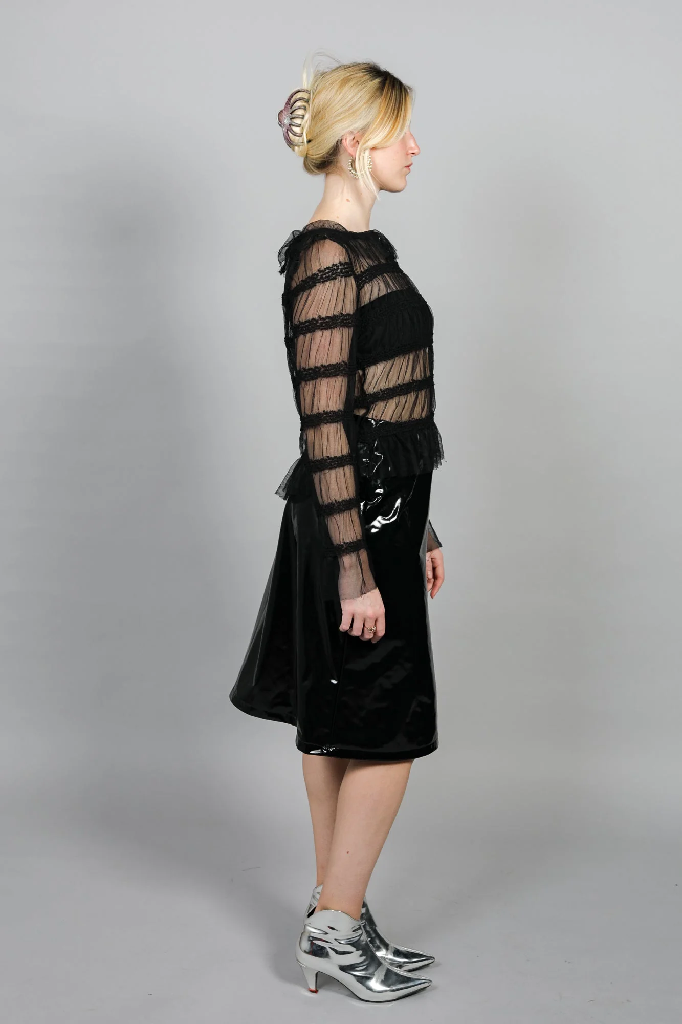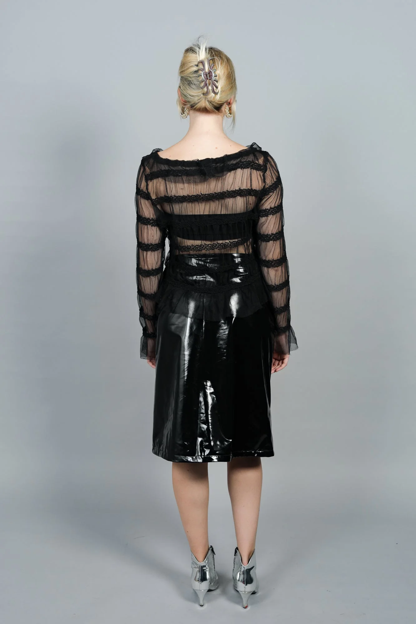 Top en tulle délicat orné de bandes brodées. Polyvalent, se porte sous un débardeur le jour ou avec un blazer le soir. Longueur 55 cm. Fabriqué en France.