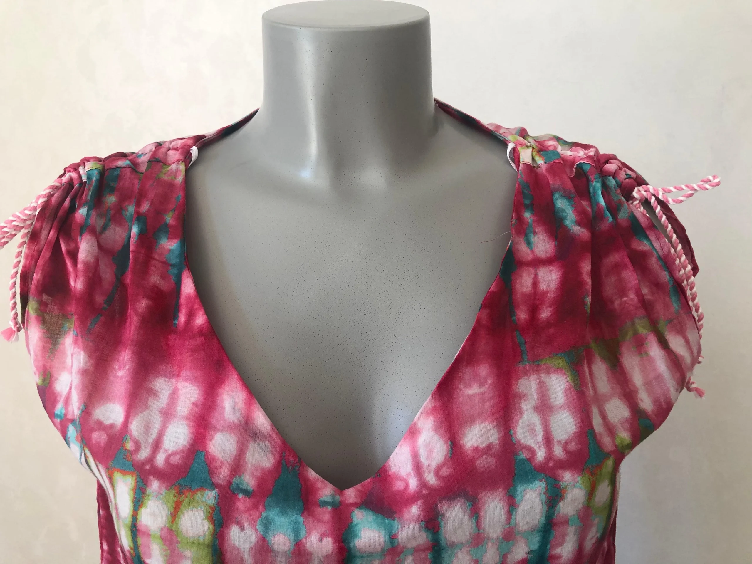 C’est un tissu très léger, avec une encolure en V et des fantaisies sur les épaules.