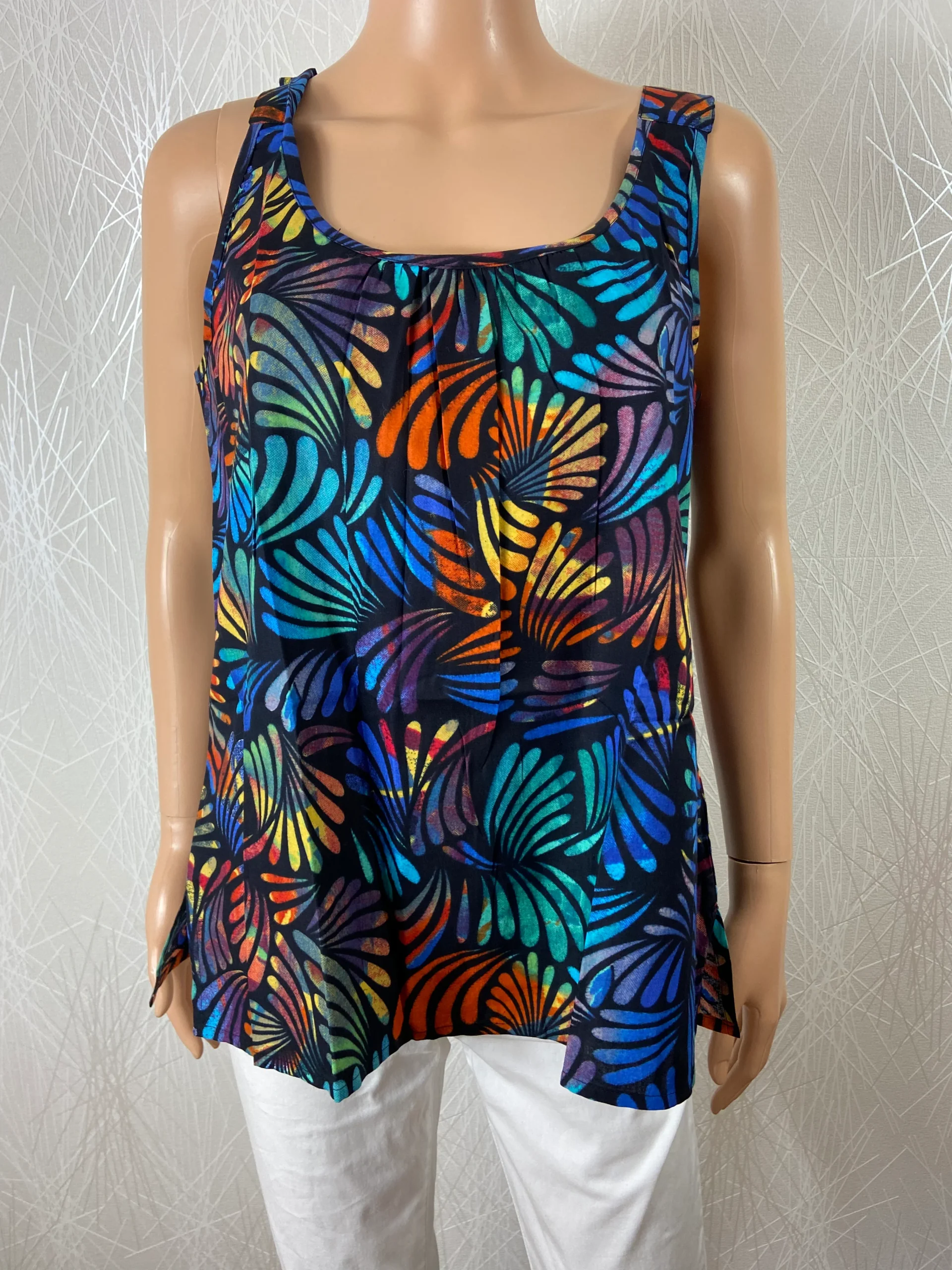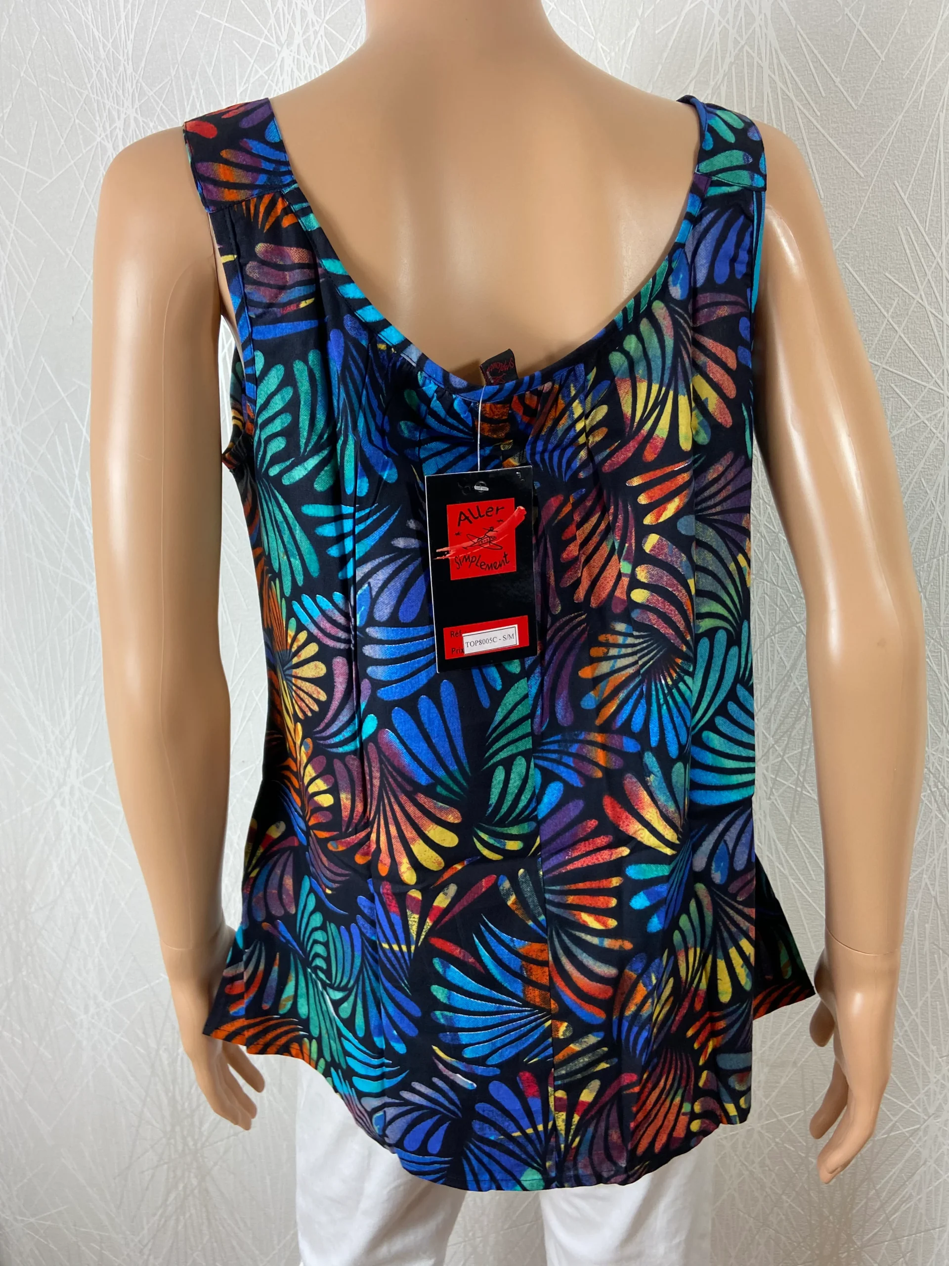 Coupe sans manches, encolure arrondie et tissu à motif multicolore.