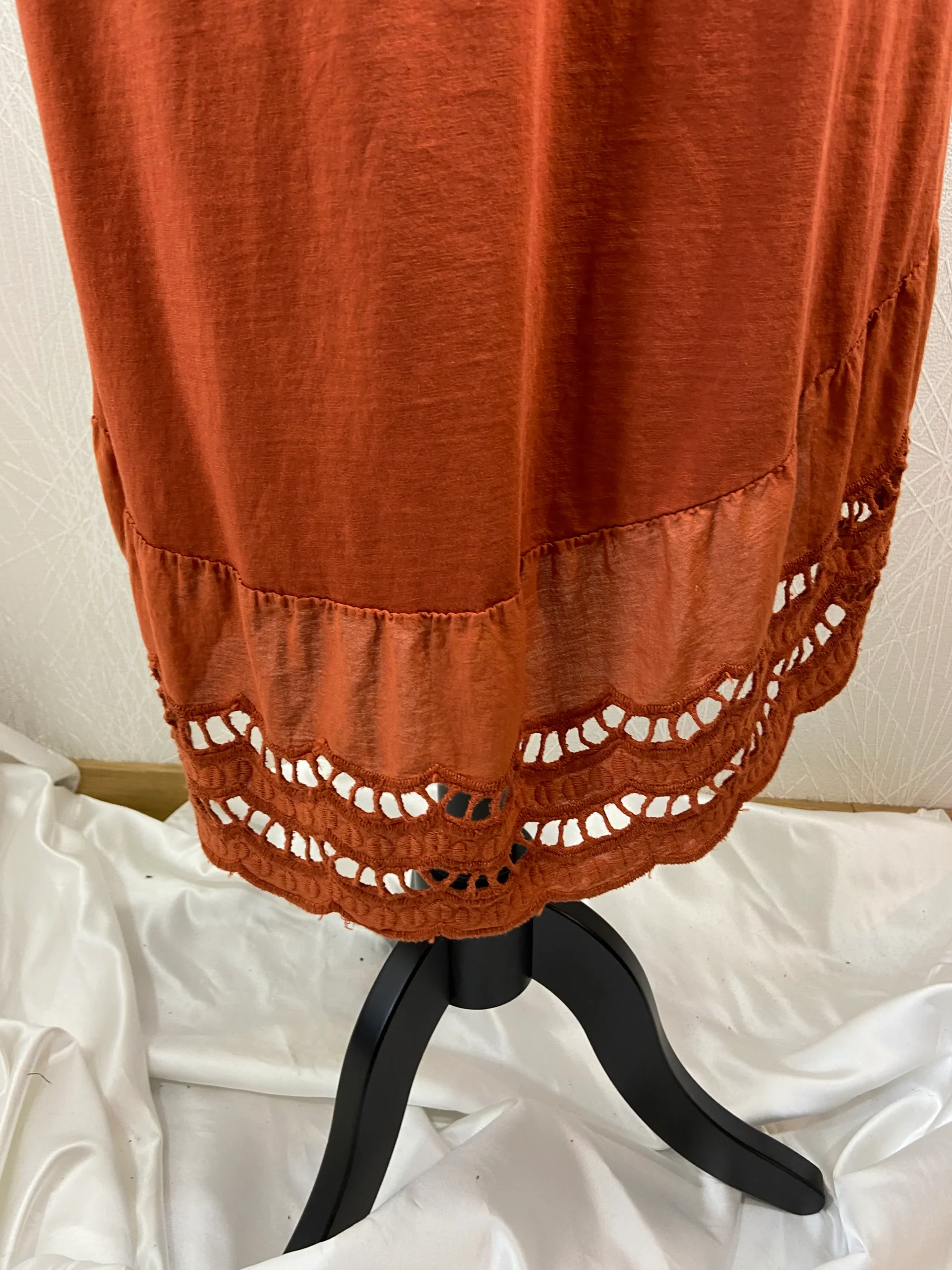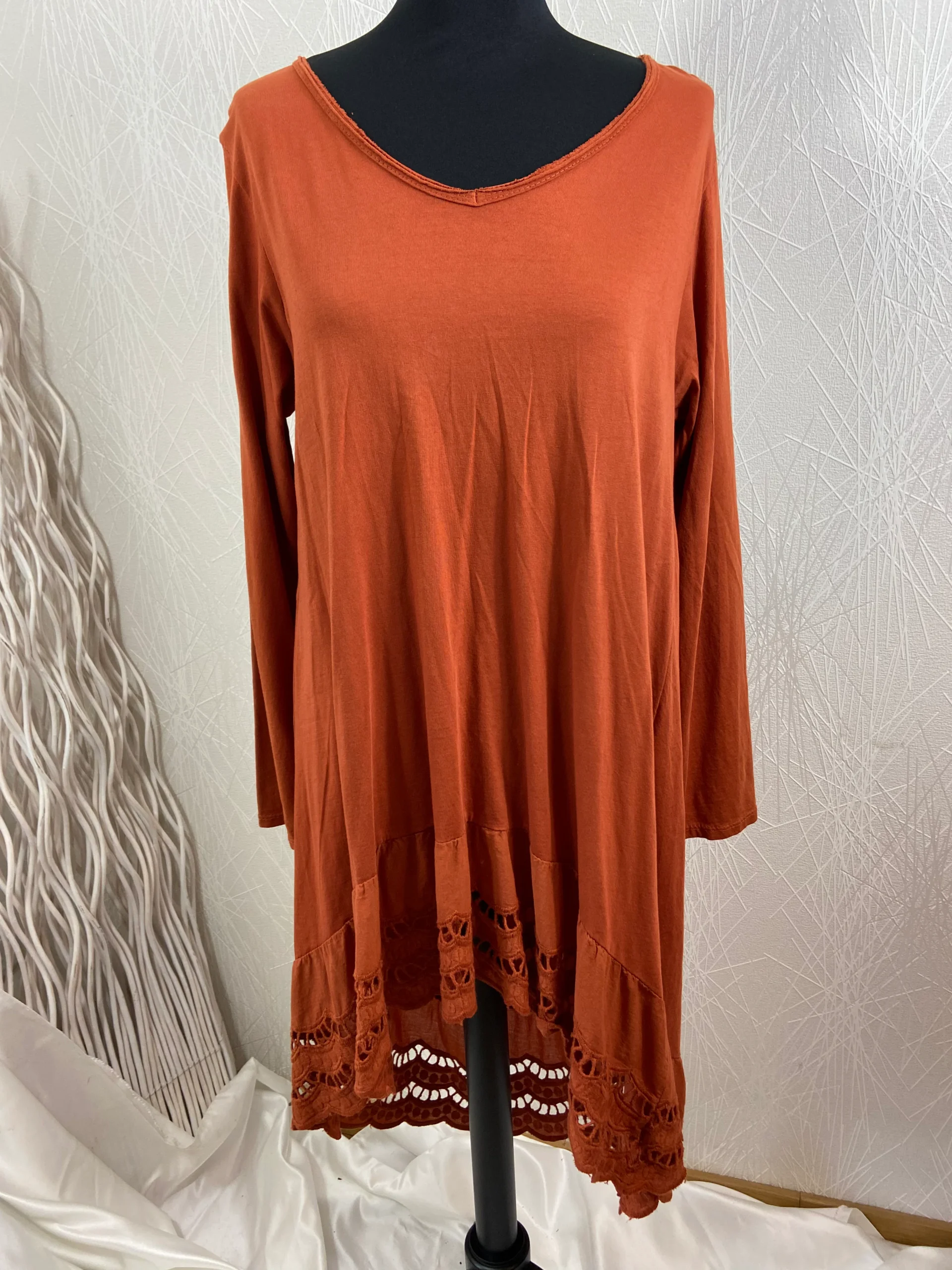 Asymétrique, encolure ronde, près du corps avec du macramé en bas de la tunique.