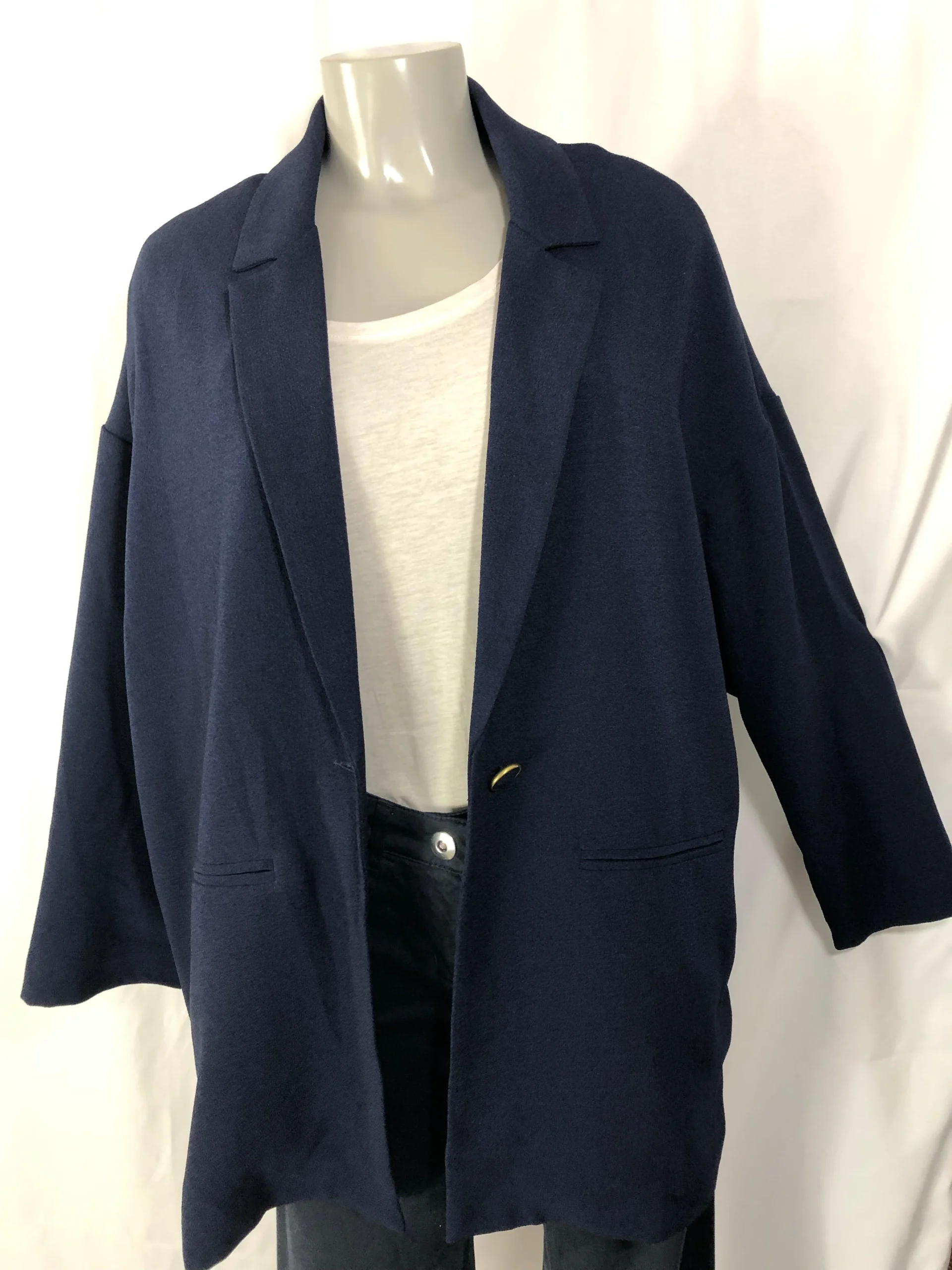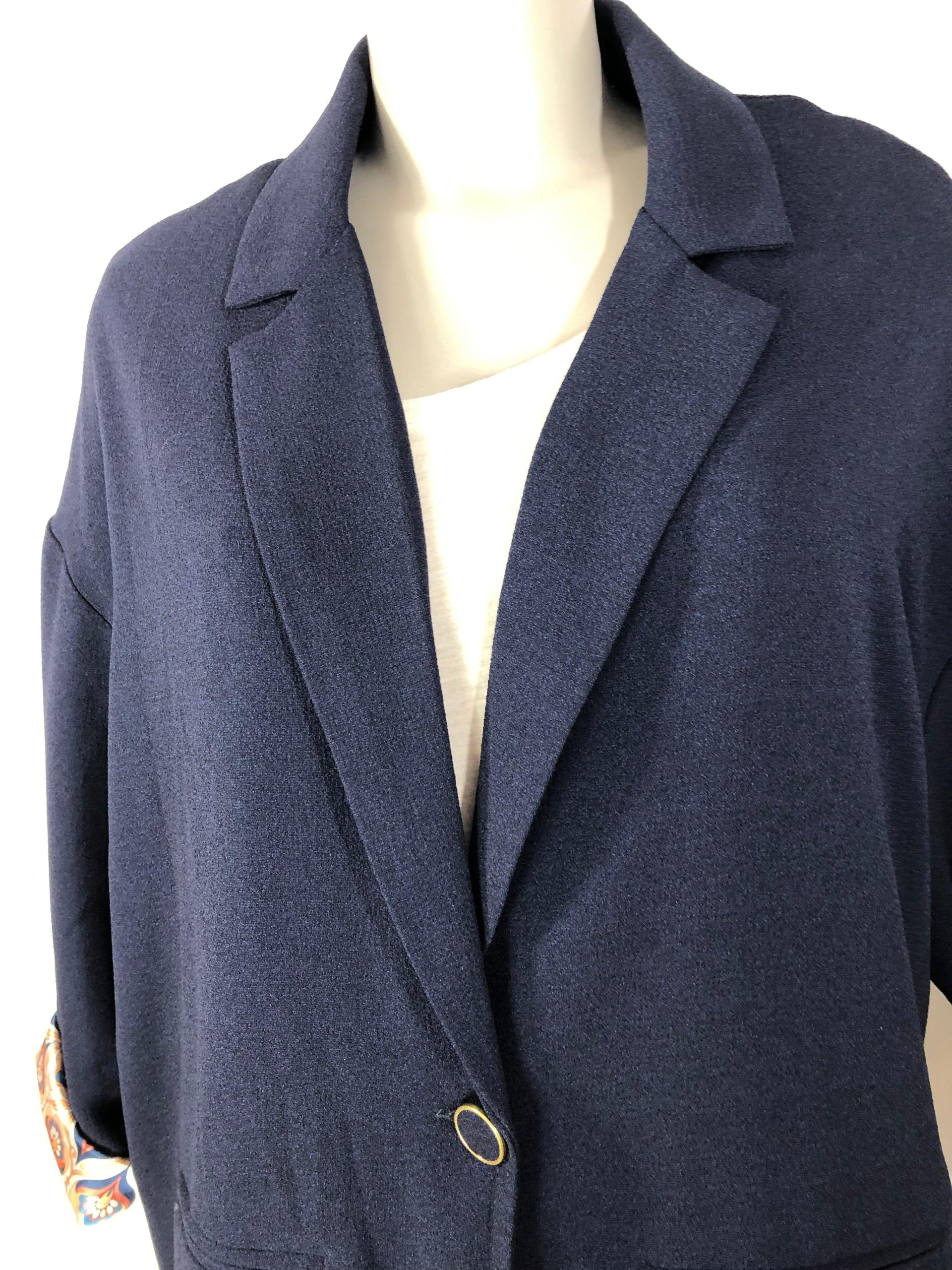 Veste blazer bleue marine pour femme de la marque Pako Litto. Tissu crêpe, coupe over-size, boutonnée sur le devant, col tailleur, manches longues et doublure imprimée. Belle fabrication de la marque Pako Litto. Matière : 92% polyester – 8% spantex doublure 100% polyester Couleur : Bleu marine Taille : L / 40 – Réf : […]