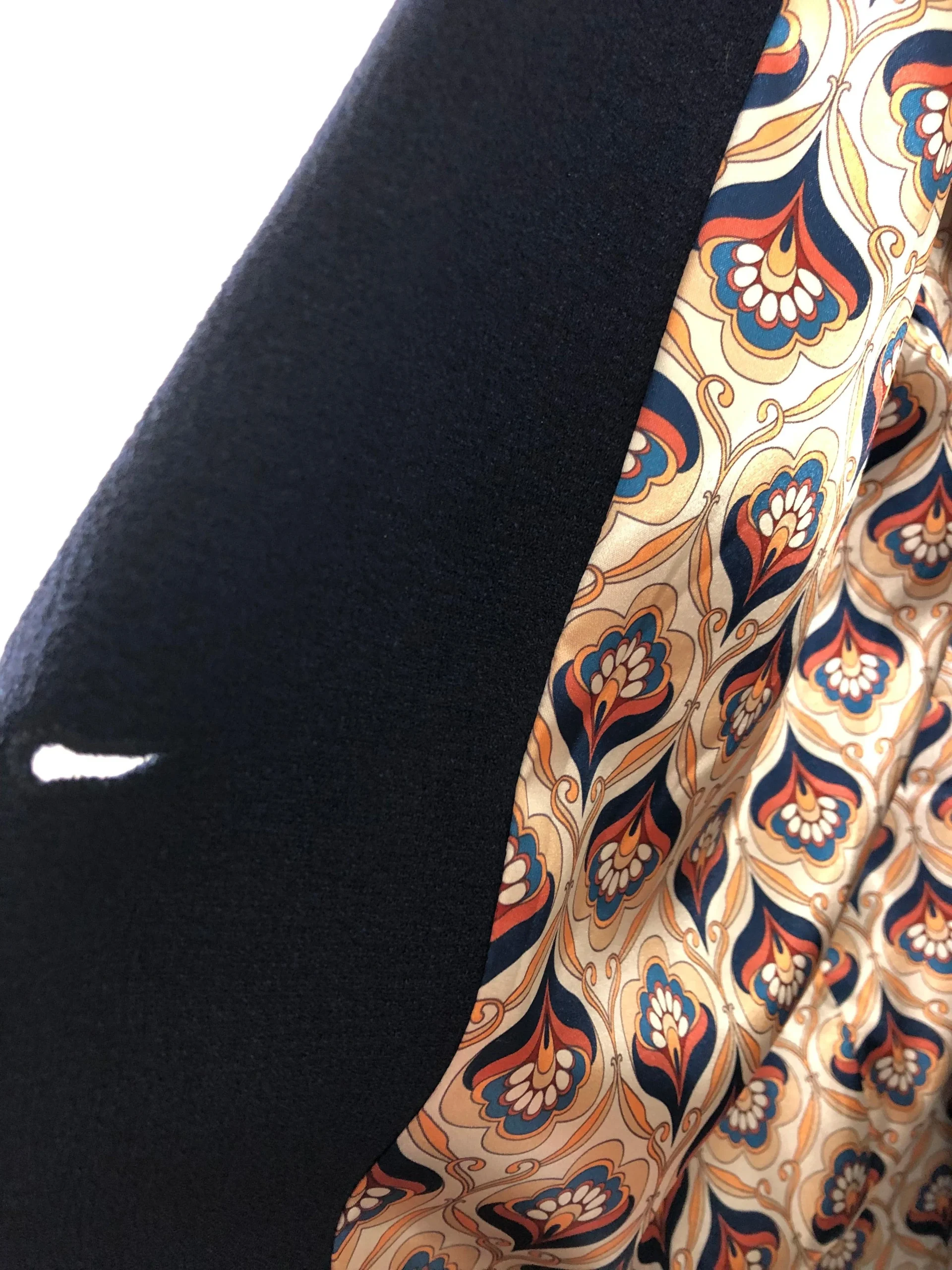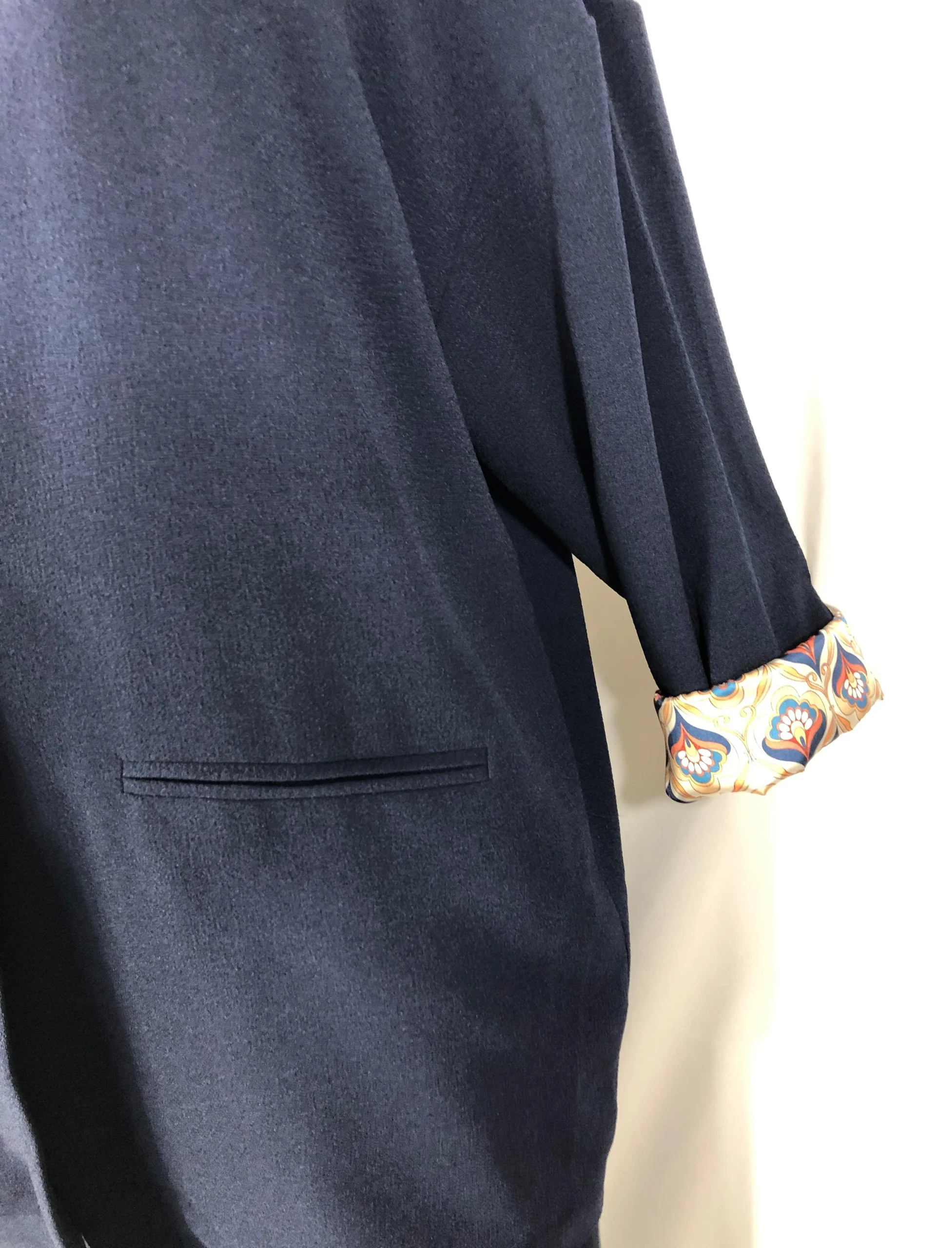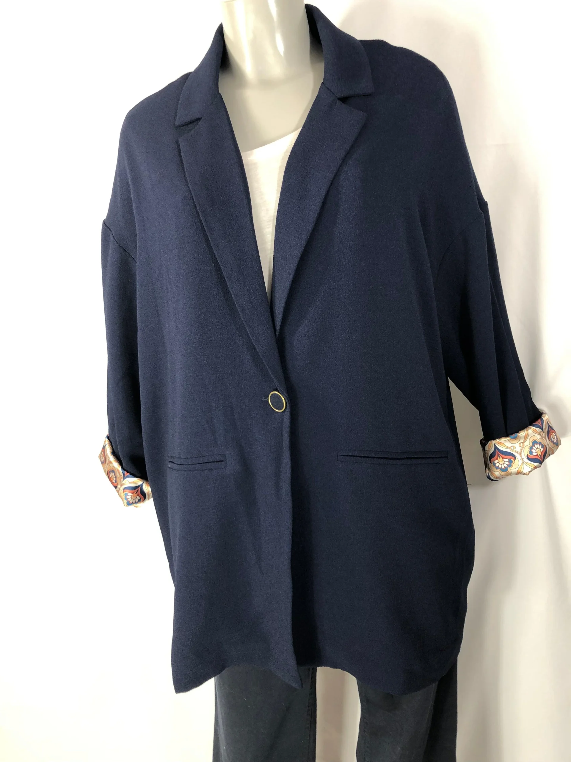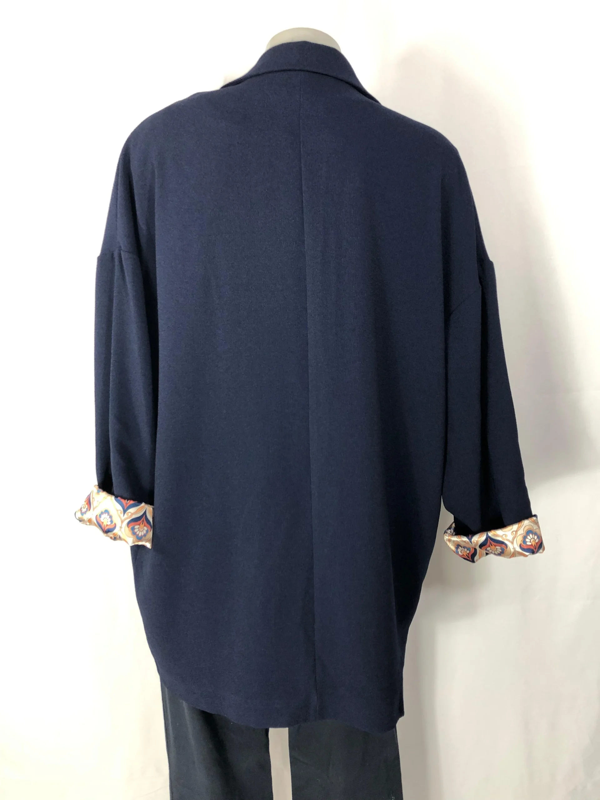 Tissu crêpe, coupe over-size, boutonnée sur le devant, col tailleur, manches longues et doublure imprimée.