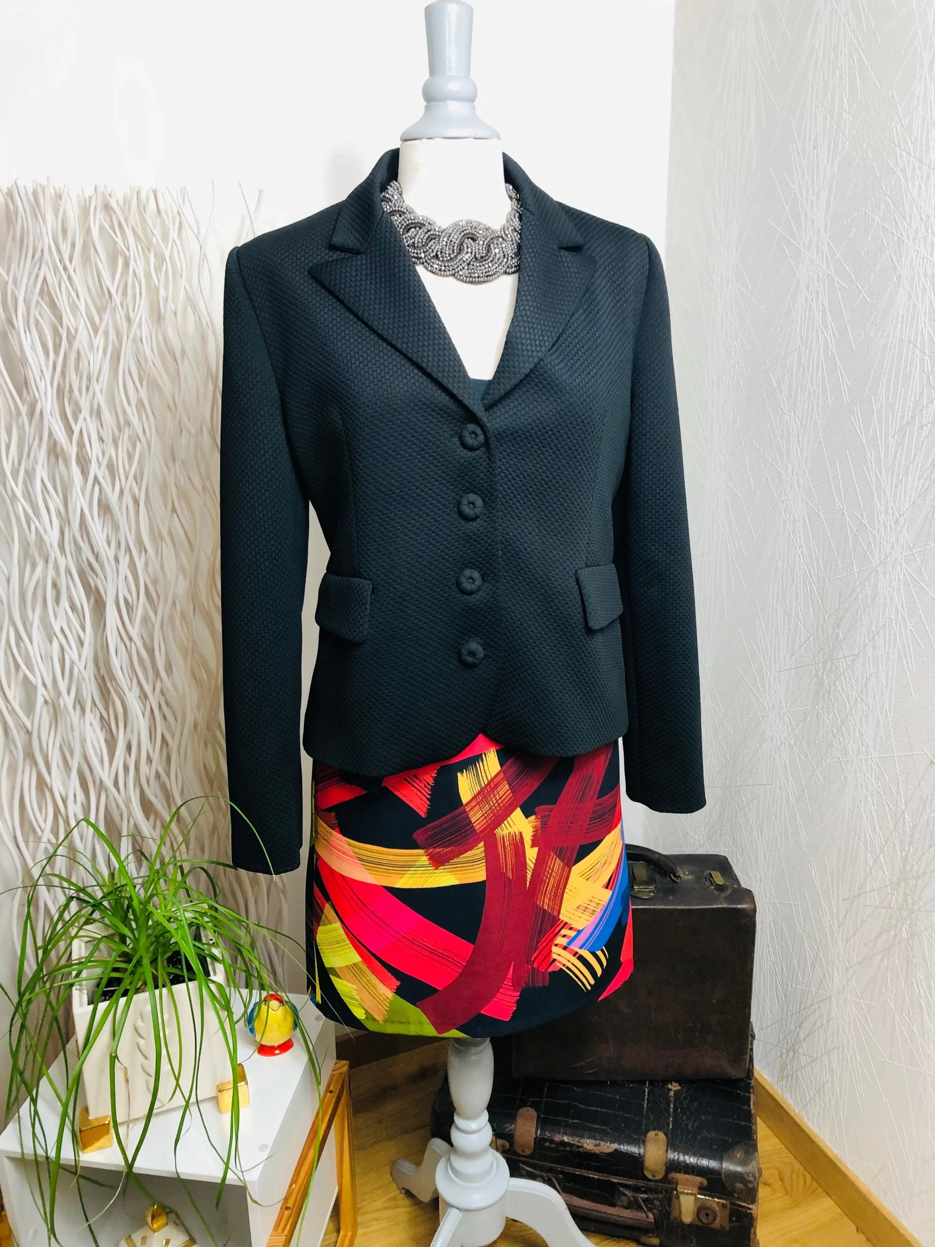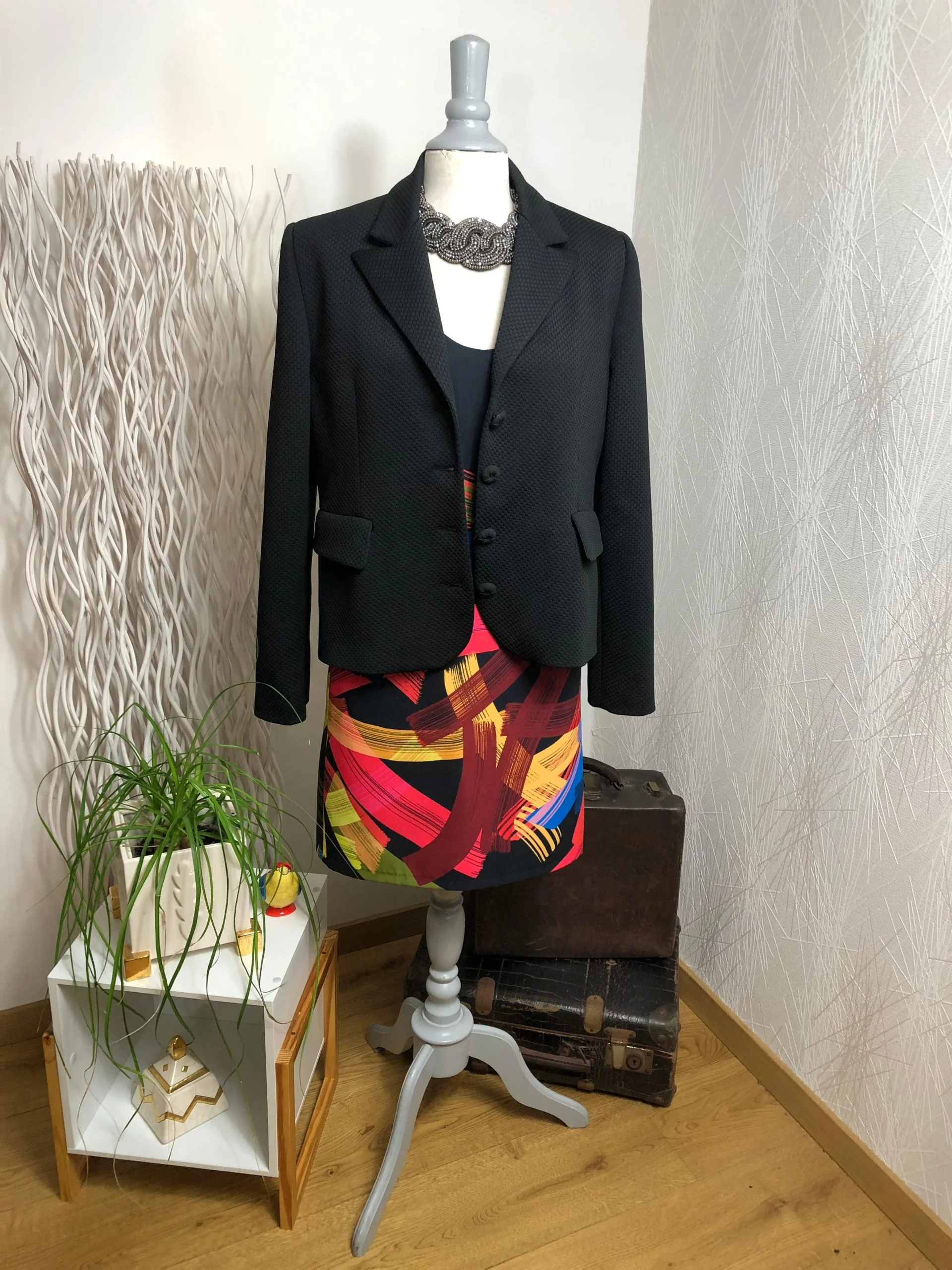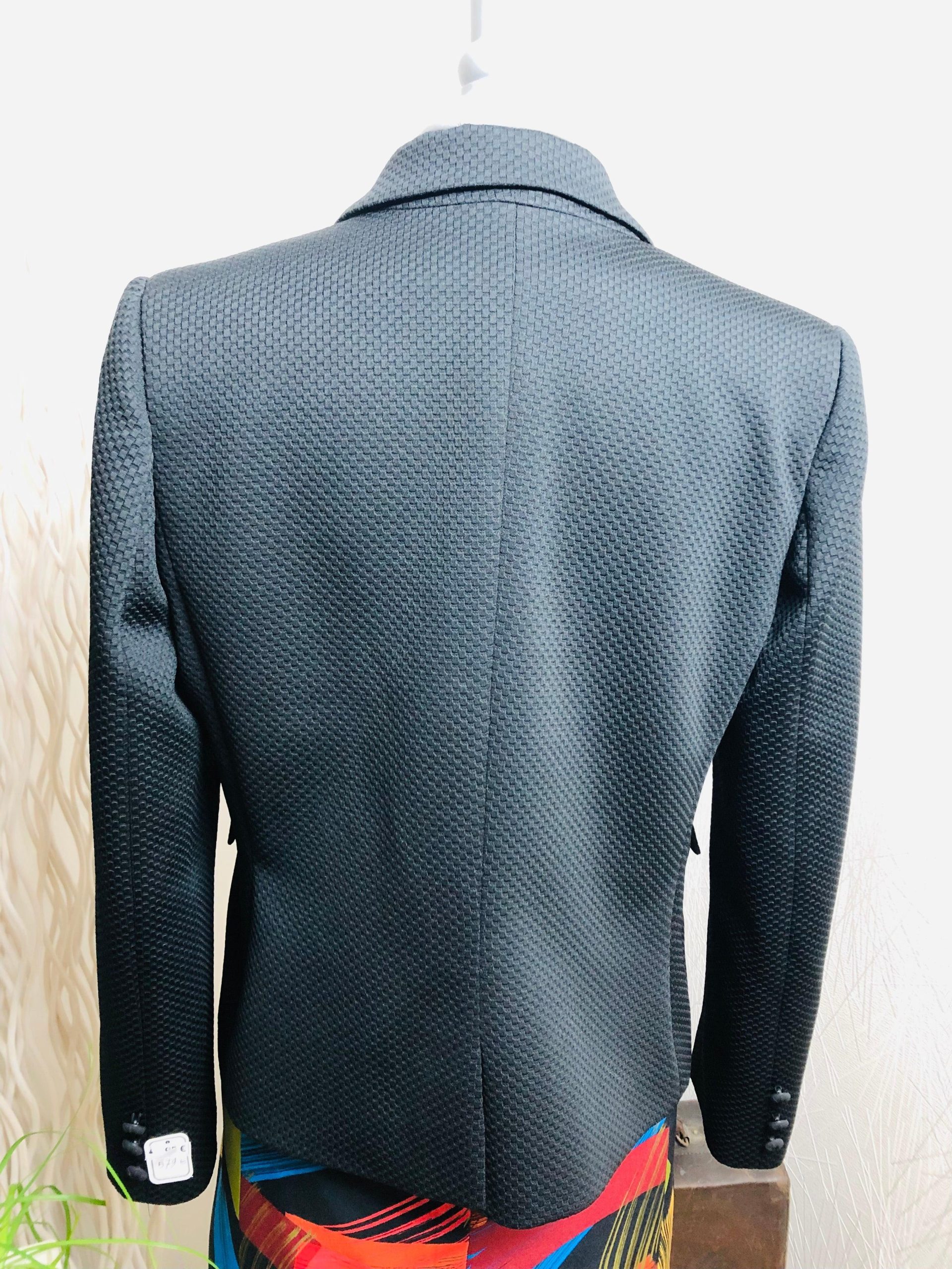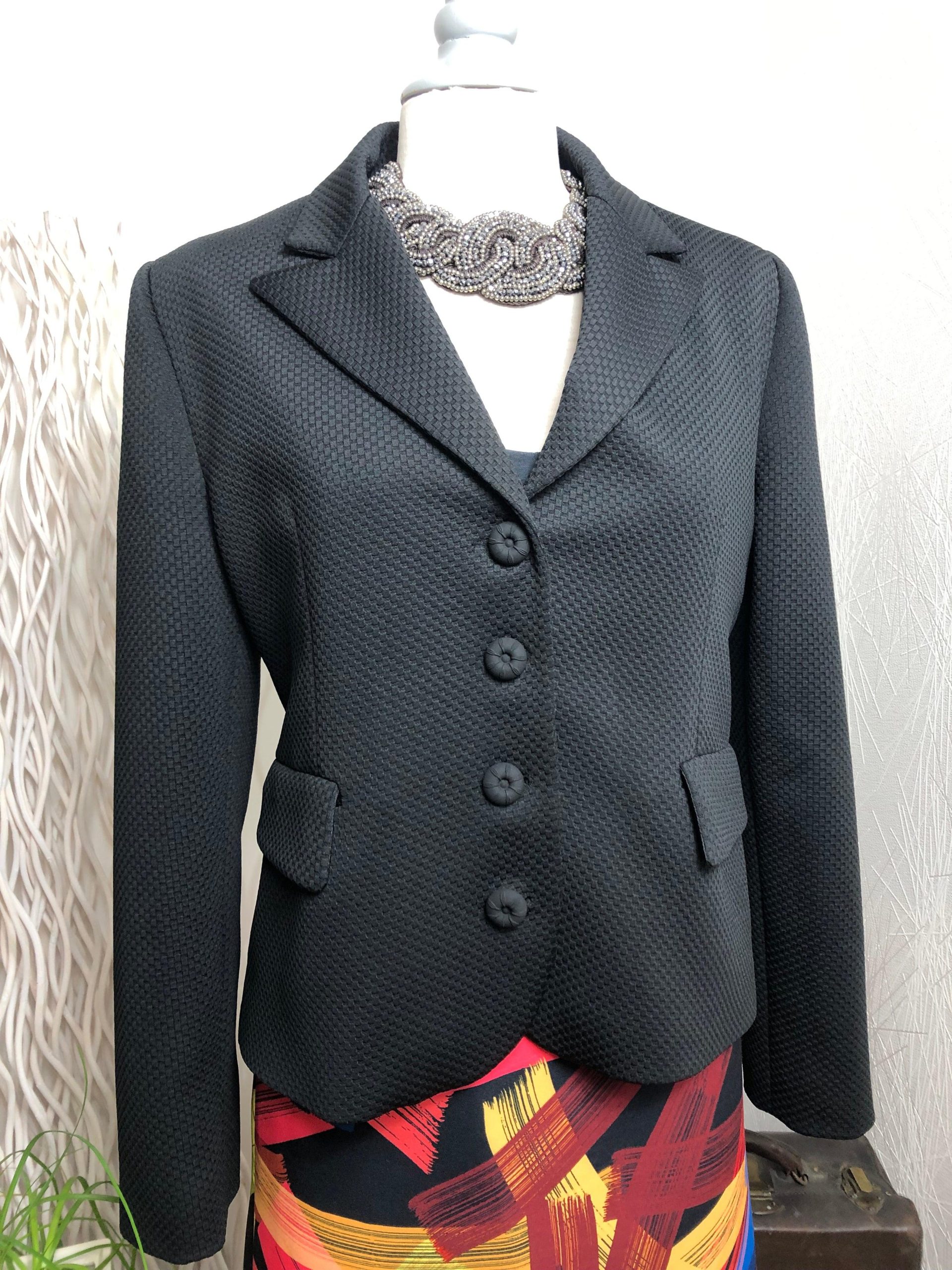Magnifique veste blazer pour femme en tissu noir structuré avec de jolis boutons assortis sur le devant et en bas des manches. Cette veste est entièrement doublée avec 2 poches passepoilées à revers.