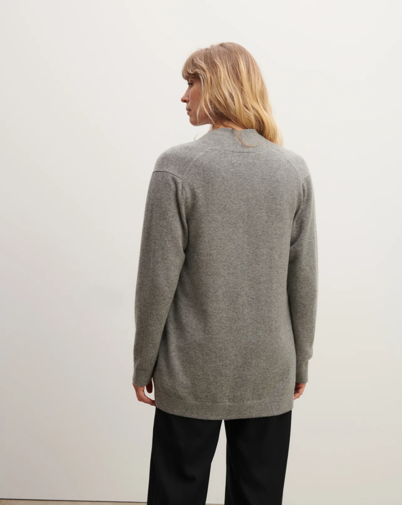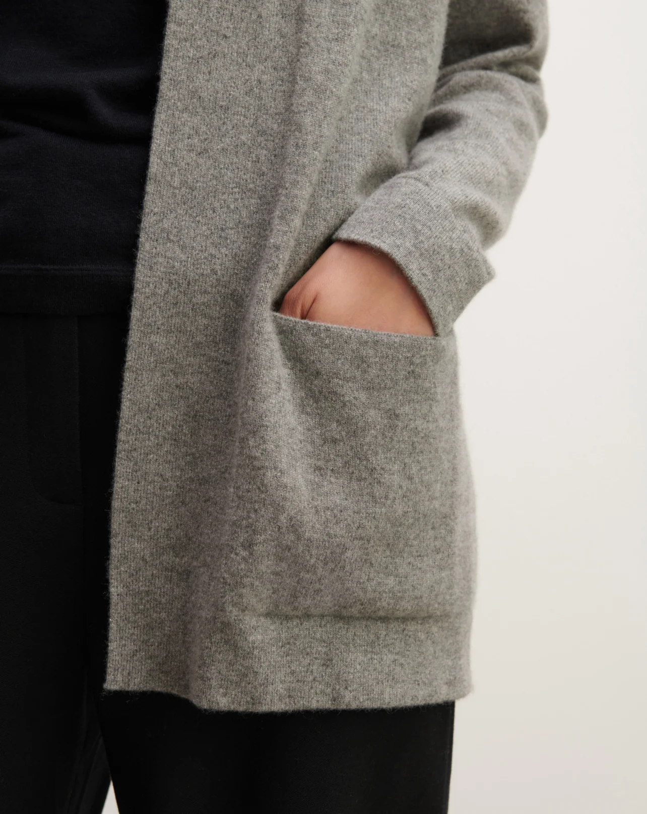 Veste femme en pur cachemire, à porter ouverte ou ceinturée pour une silhouette cosy chic. -Coupe droite et longue -Emmanchure droite -Encolure à côtes
