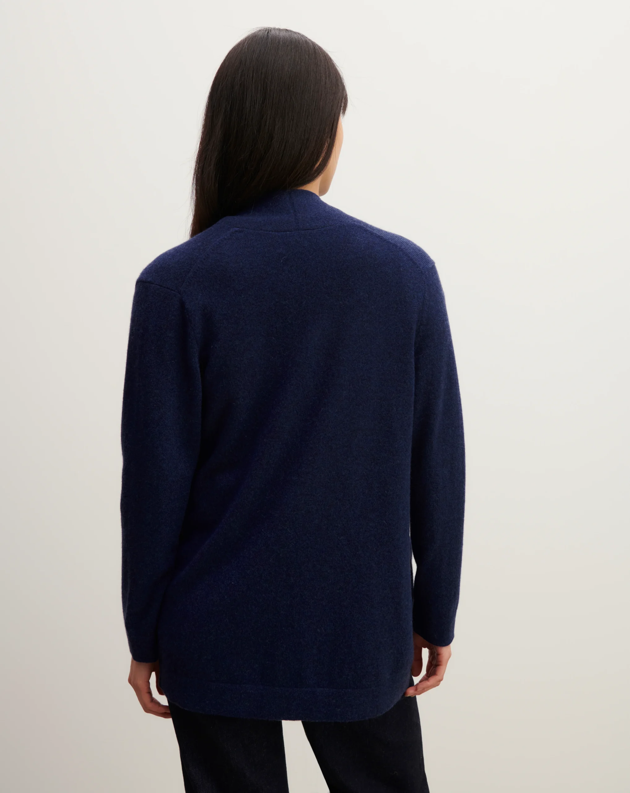 Veste femme en pur cachemire, à porter ouverte ou ceinturée pour une silhouette cosy chic. -Coupe droite et longue -Emmanchure droite -Encolure à côtes