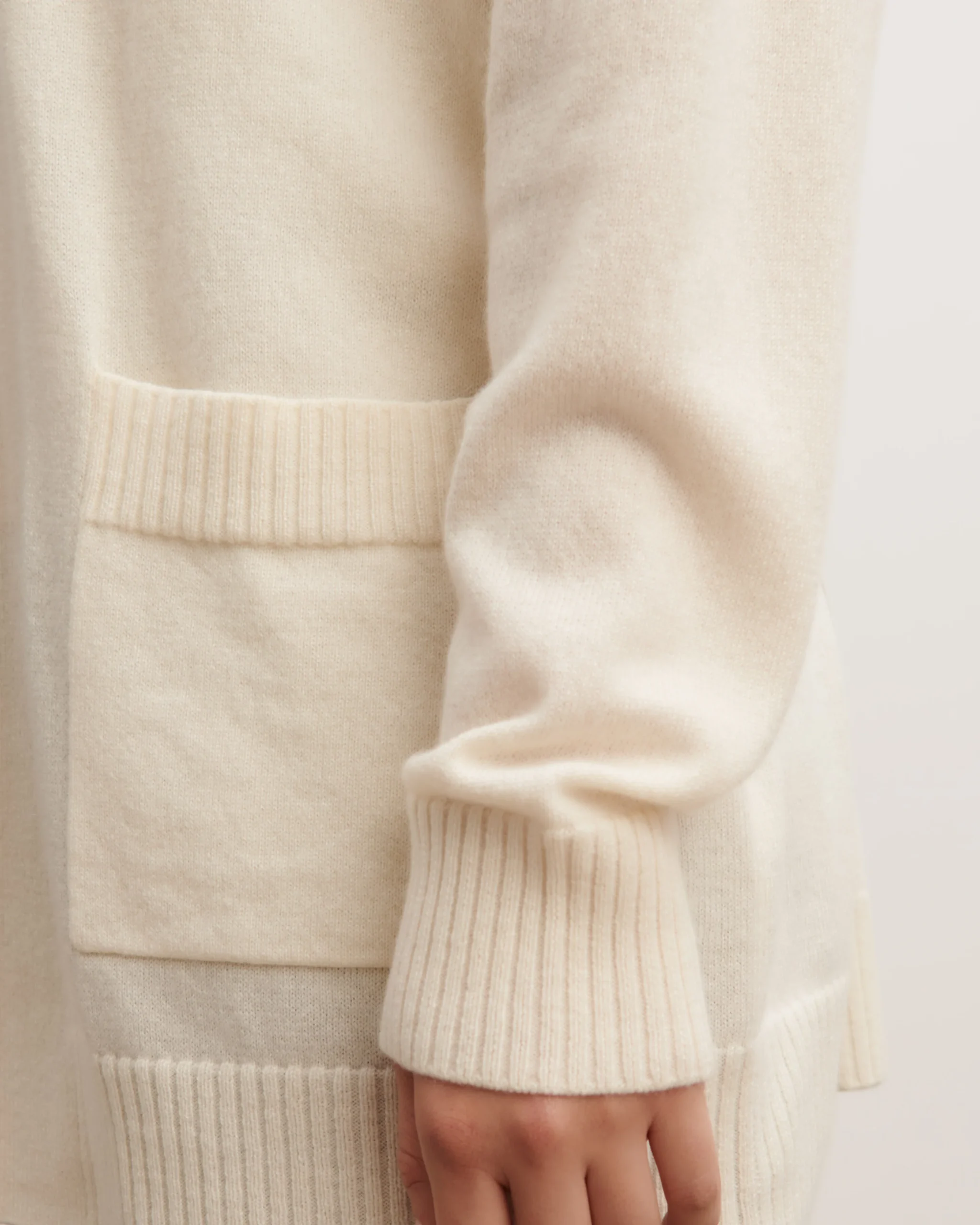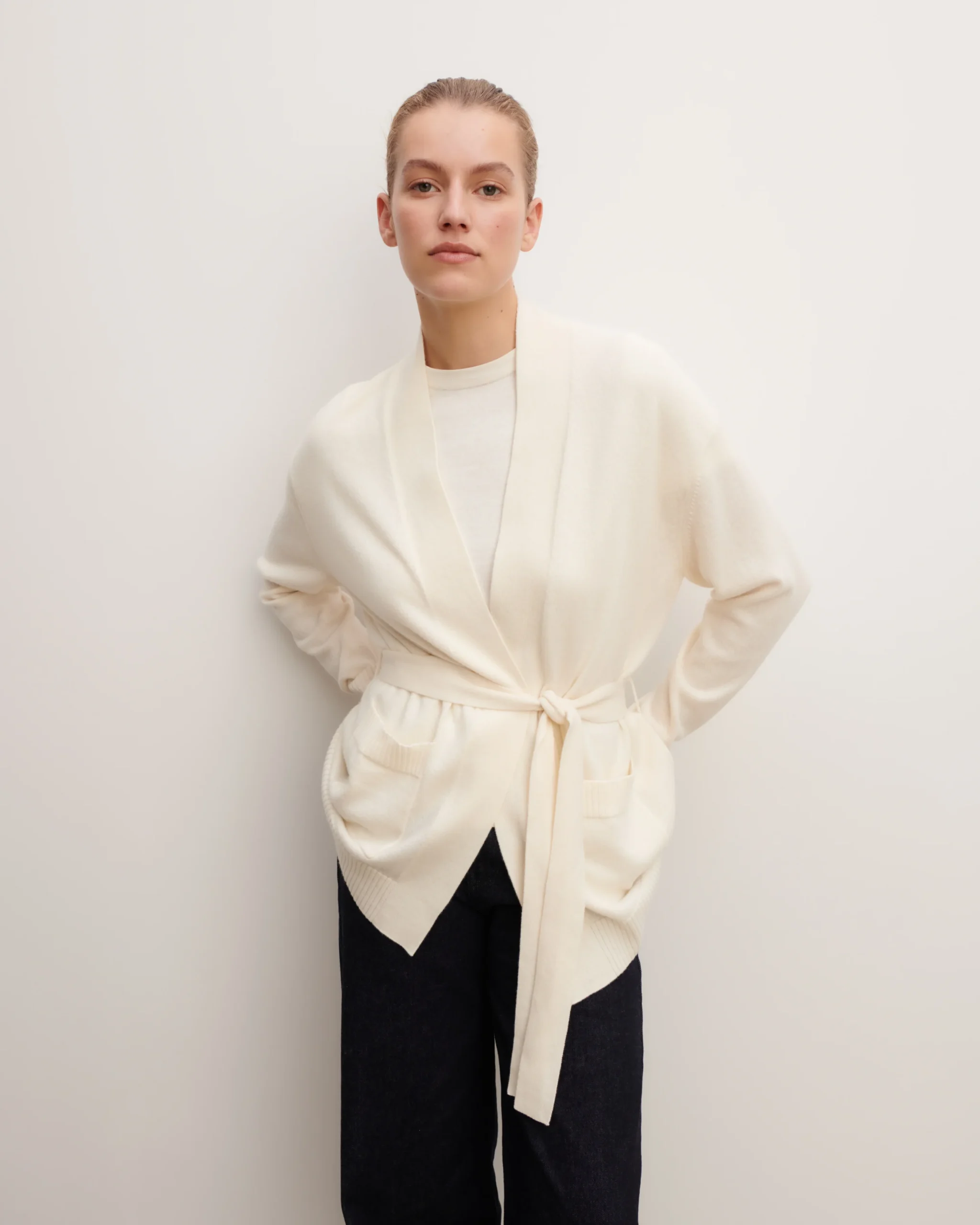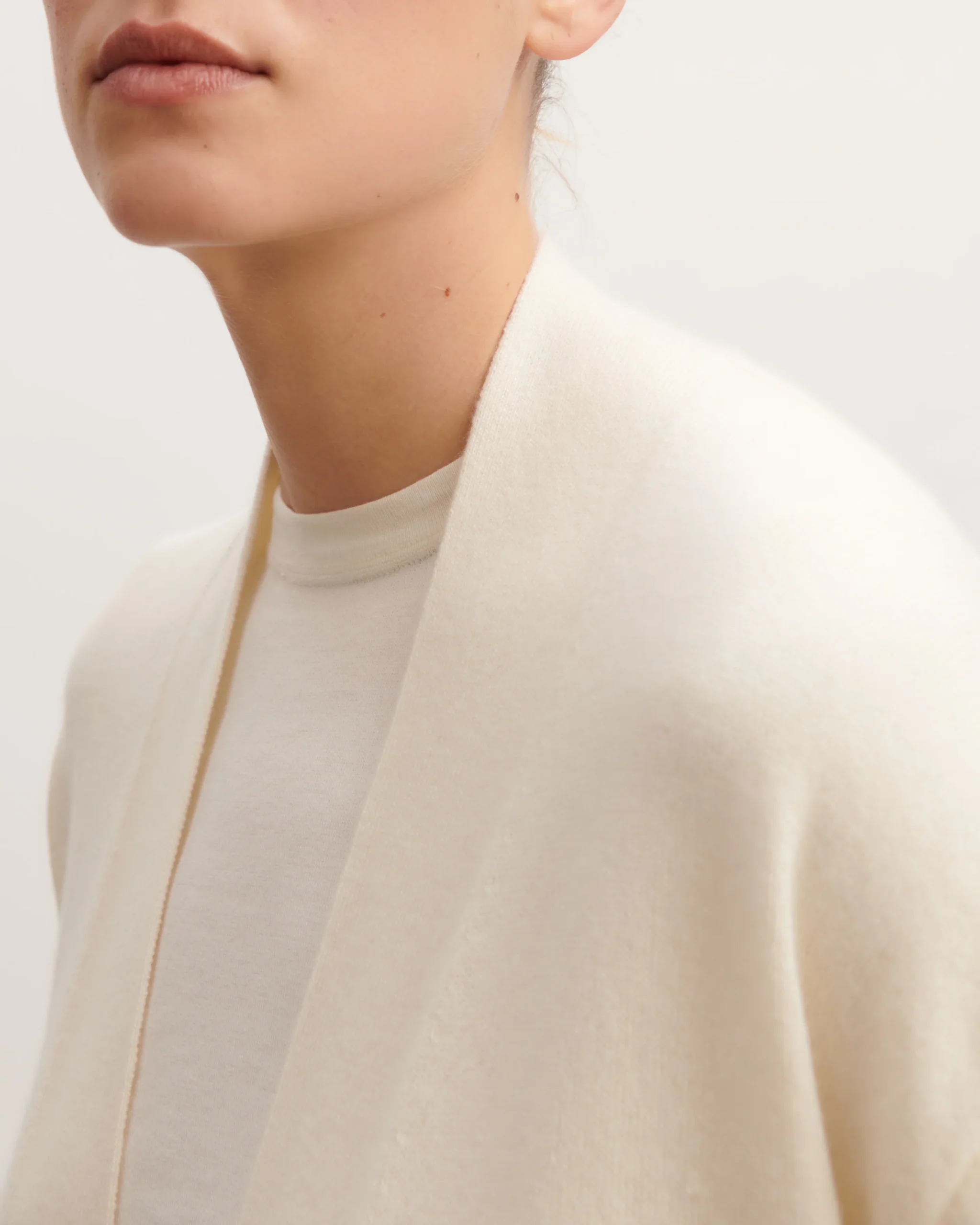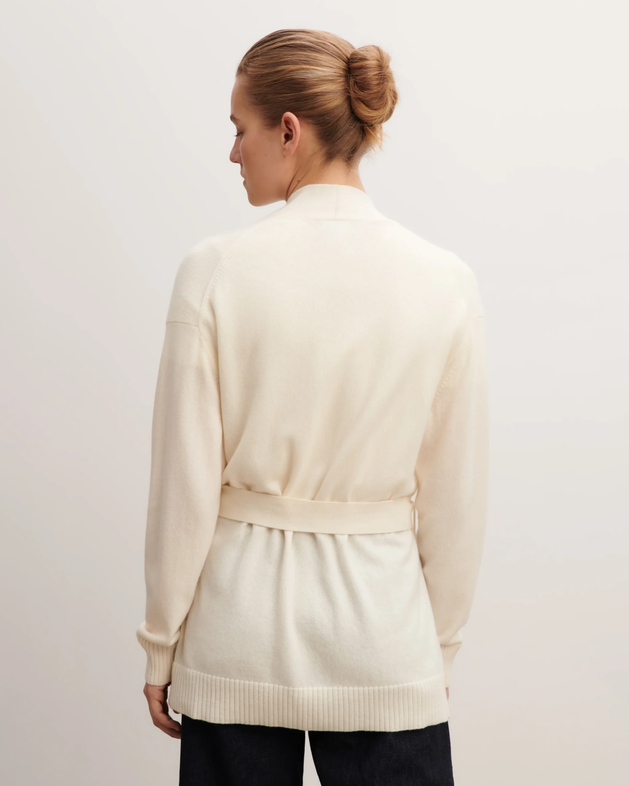 Veste cosy en pur cachemire, à porter ouverte ou cintrée. Modèle long, à coupe fluide et manches longues.