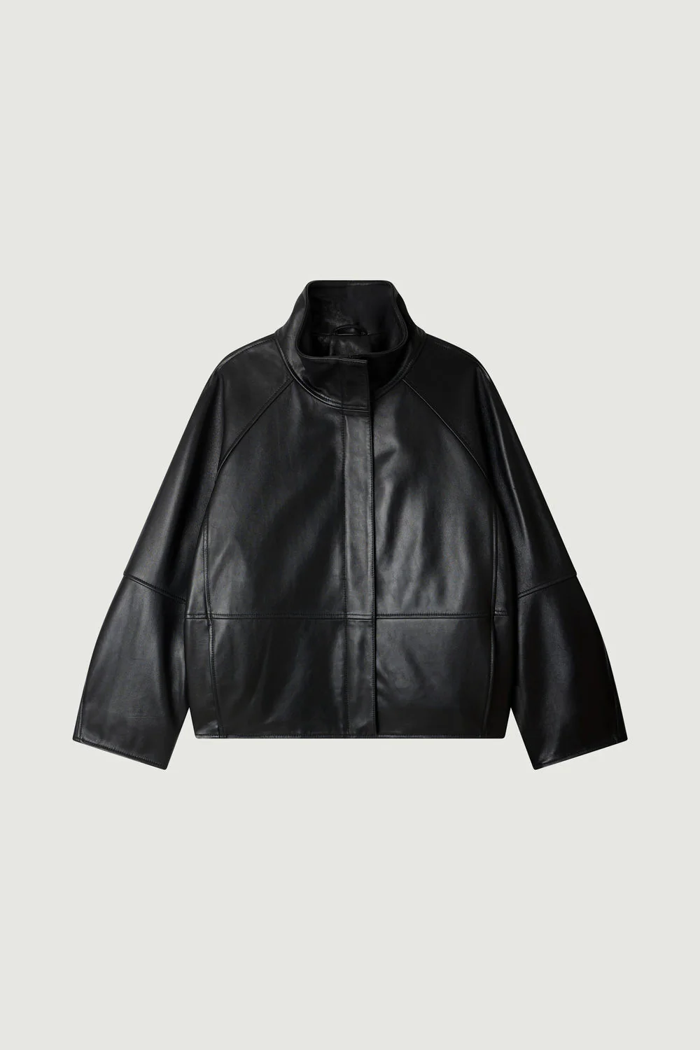 GAMMA est une veste en cuir souple, au design volontairement rond et oversize. Ses manches longues et son col montant apportent une allure moderne. La fermeture zippée et les deux poches devant ajoutent une touche fonctionnelle. Les pinces au dos accentuent le volume pour un look décontracté.