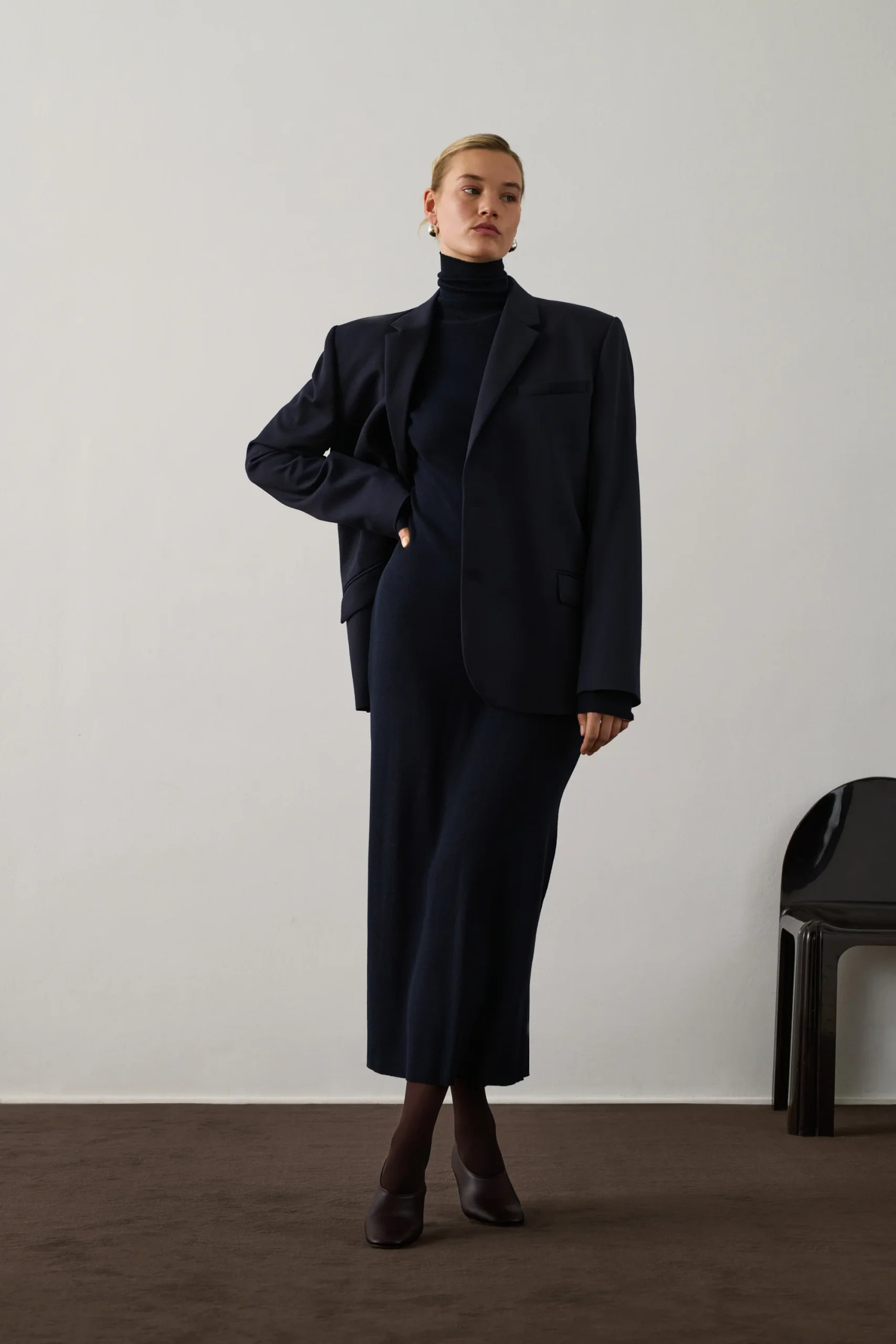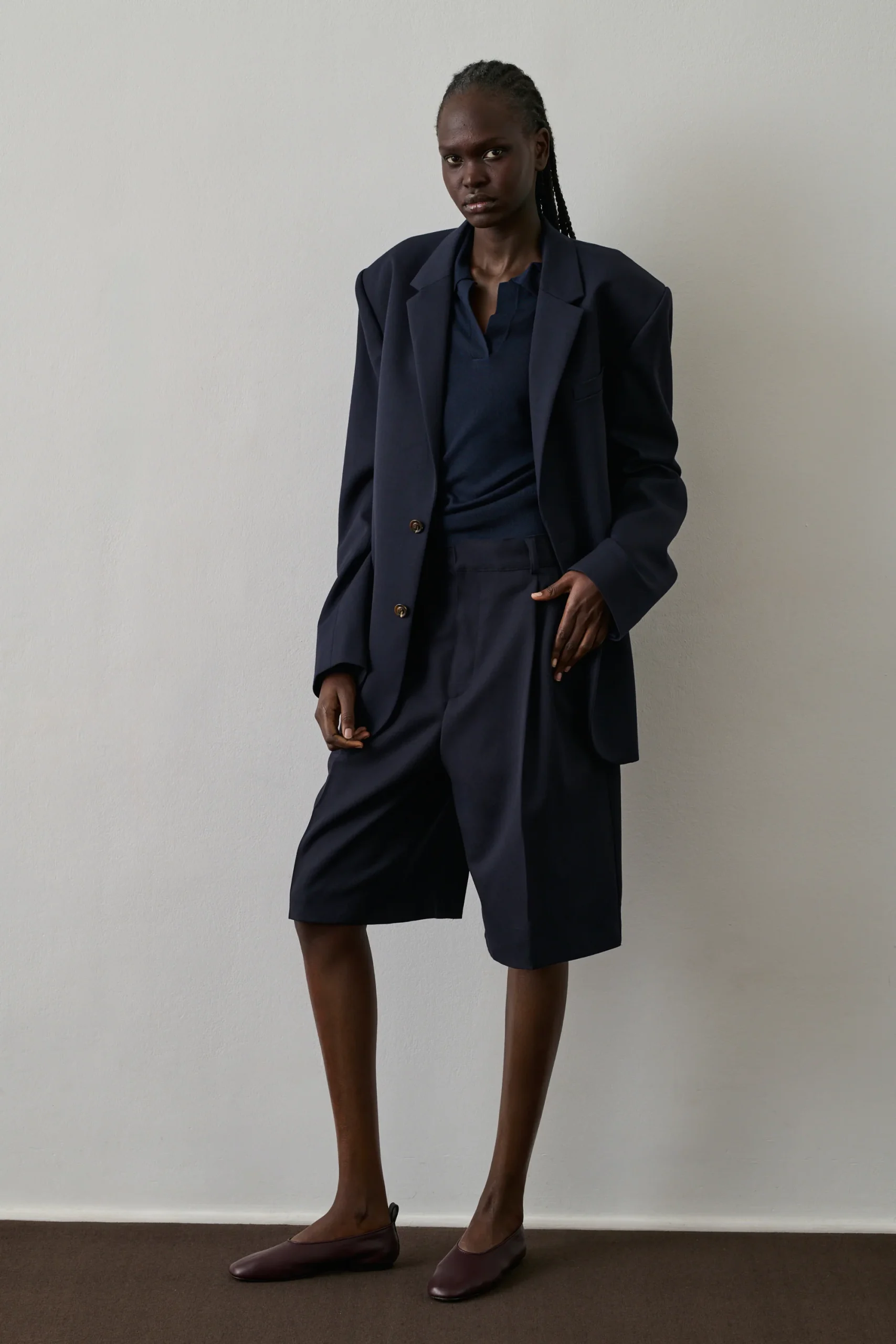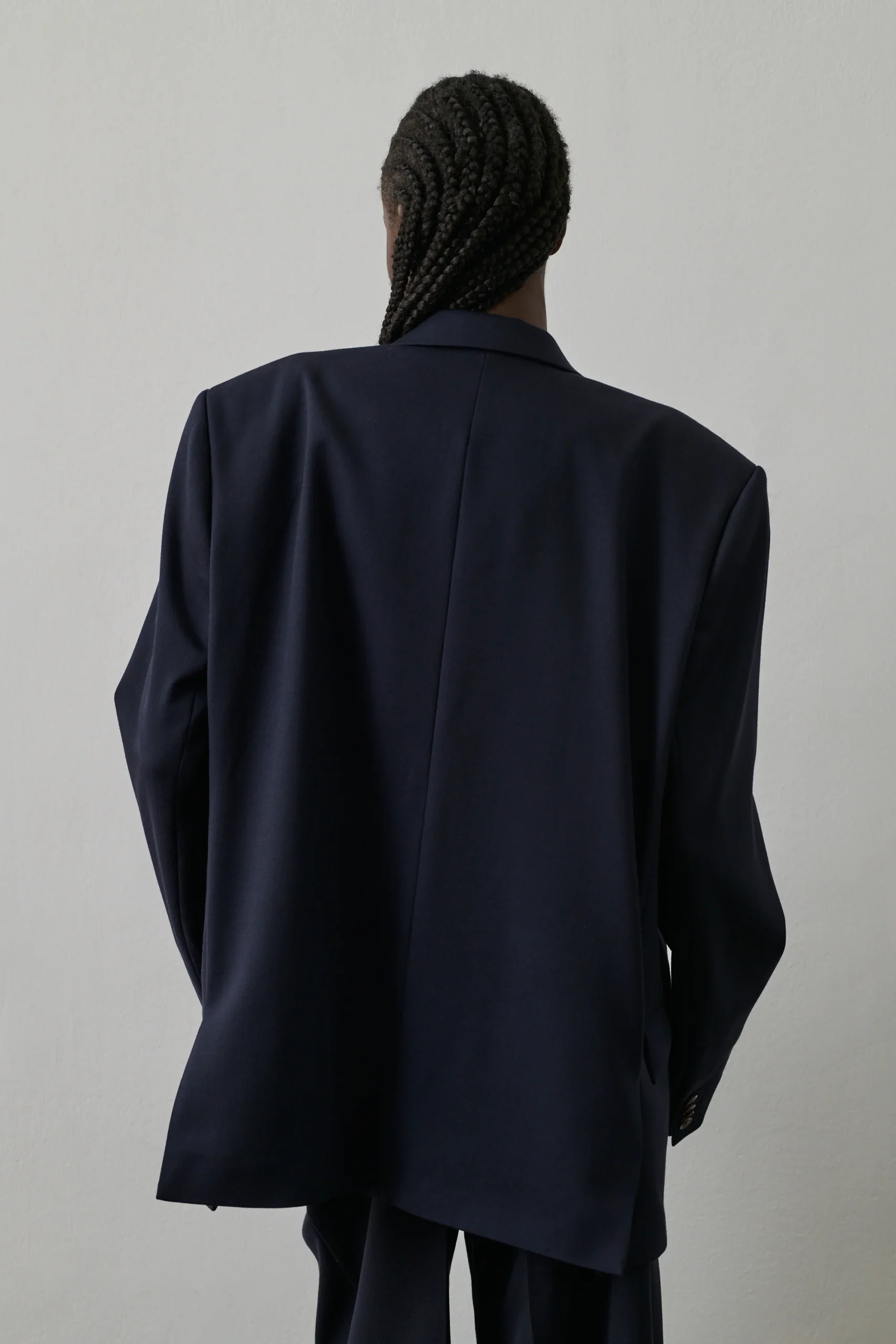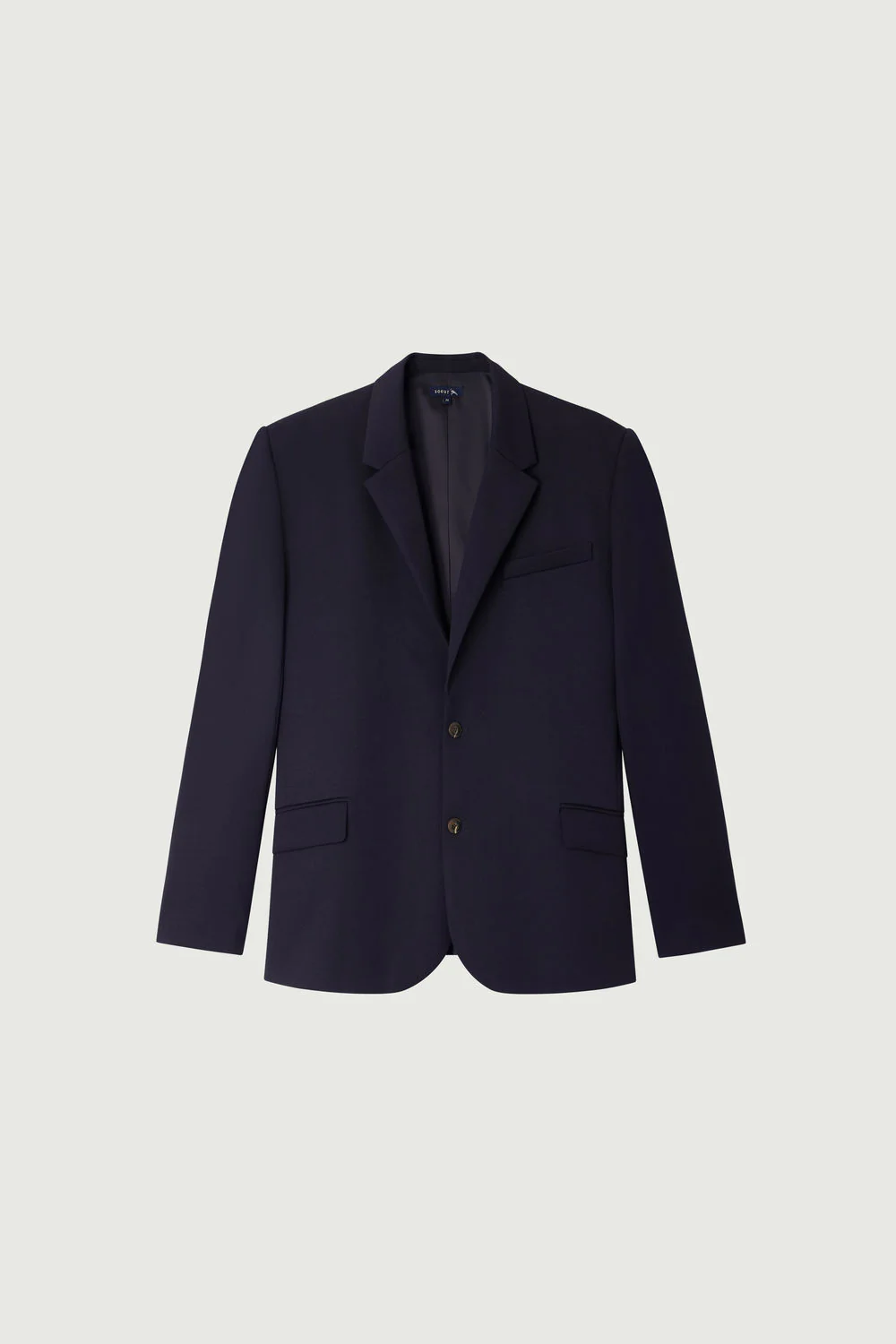GIANI est une veste tailleur en gabardine de laine vierge bleu nuit. Son volume ample et son col tailleur rappellent les codes du vestiaire masculin. Entièrement doublée, elle assure confort et style.