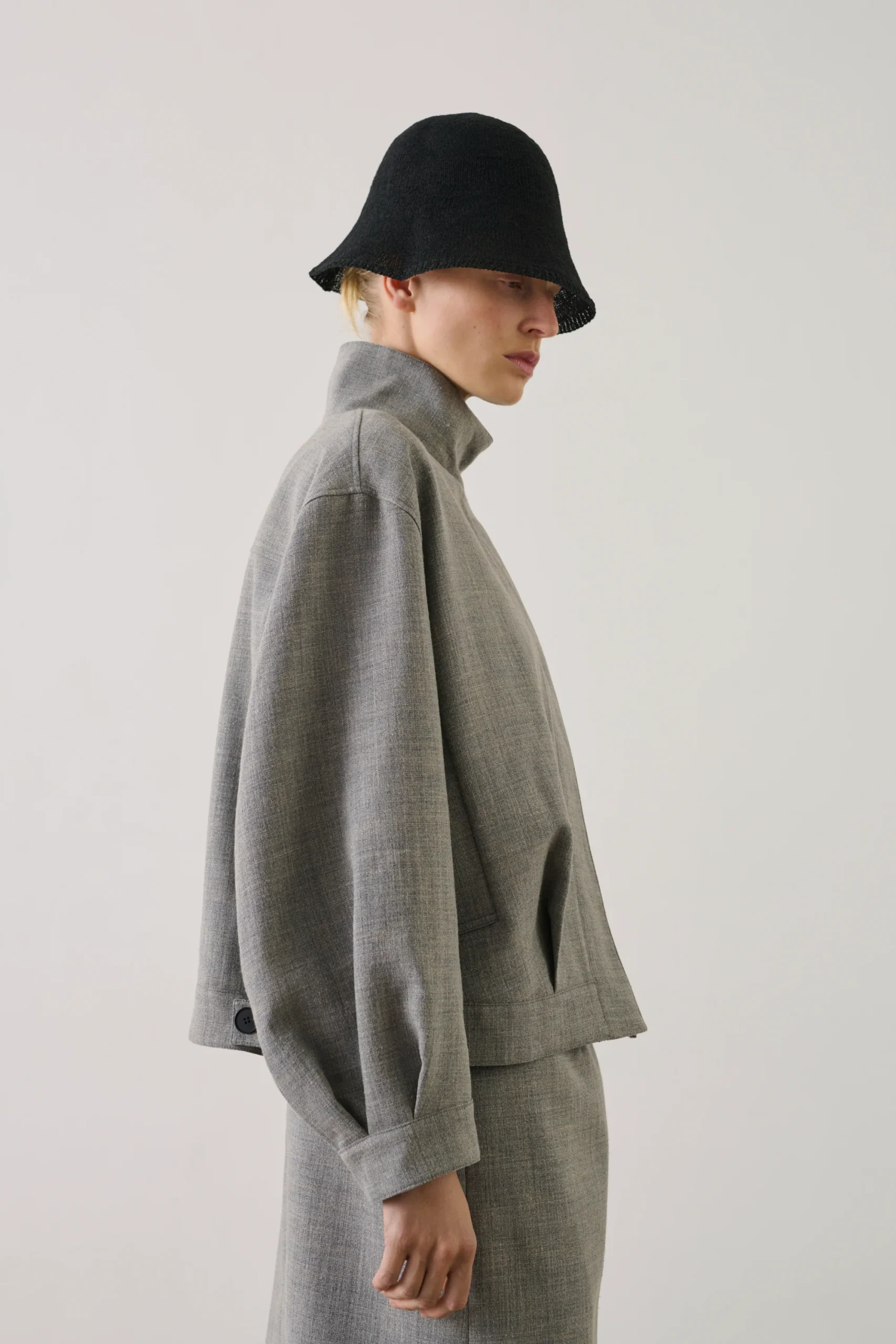 – Couple ample, forme ronde – Manches longues arrondies – Col montant – Patte de boutonnage devant, bas de corps et poignets – Deux poches devant – Toile de lin chinée épaisse